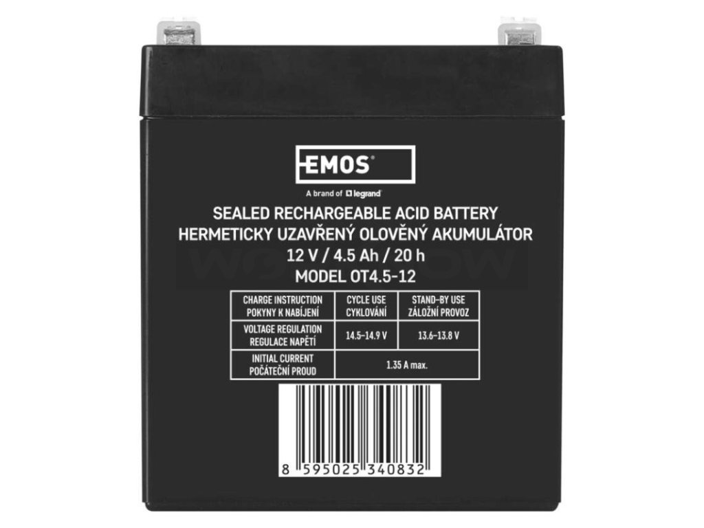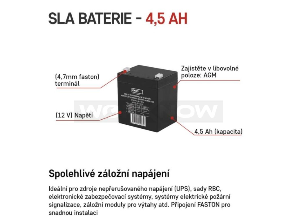 Bezúdržbové olověné akumulátory EMOS jsou určeny jako náhradní baterie pro záložní zdroje UPS, RBC kity, elektronické zabezpečovací systémy (EZS), elektrickou požární signalizaci (EPS), záložní systémy výtahů apod.