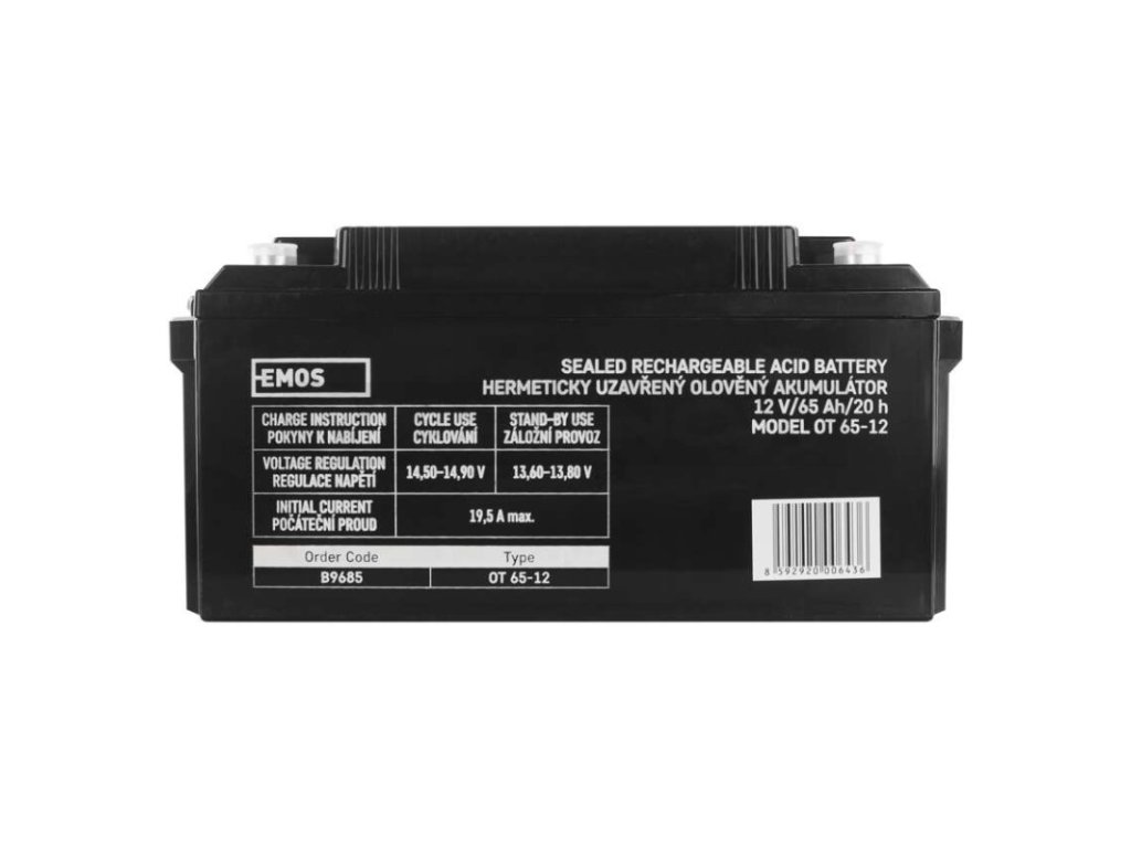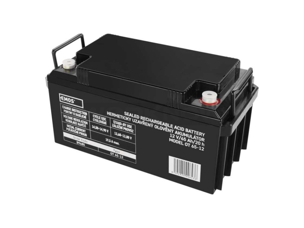 Akumulátor EMOS je vhodný jako náhradní baterie pro záložní zdroje UPS, RBC kity, nouzové osvětlení, echoloty, sonary, elektronické systémy EZS, EPS apod.Bezúdržbový, ventilem řízený olověný akumulátor v provedení AGM umožňuje být používán v libovolné poloze. Optimální životnost v záložních systémech je 5 let.Nabíjení baterie musí být prováděno vhodným napájecím zdrojem nebo nabíječem, který má hodnotu nabíjecího napětí 14,4 V pro 12 V akumulátory a 7,2 V pro 6 V akumulátory. V případě, že nabíječ nebo napájecí zdroj nemá tyto parametry, tak dochází k neúplnému nabíjení a dochází k tomu, že akumulátor bude rychle spotřebován a v krajním případě zničen. V tomto případě nelze uznat reklamaci akumulátoru.