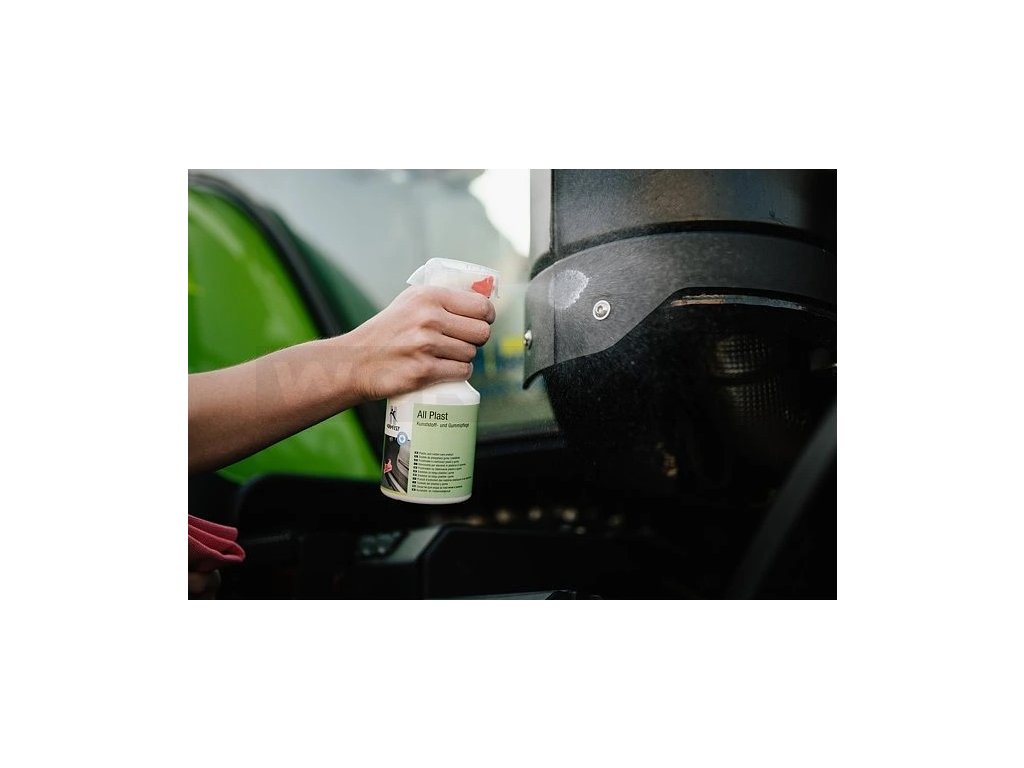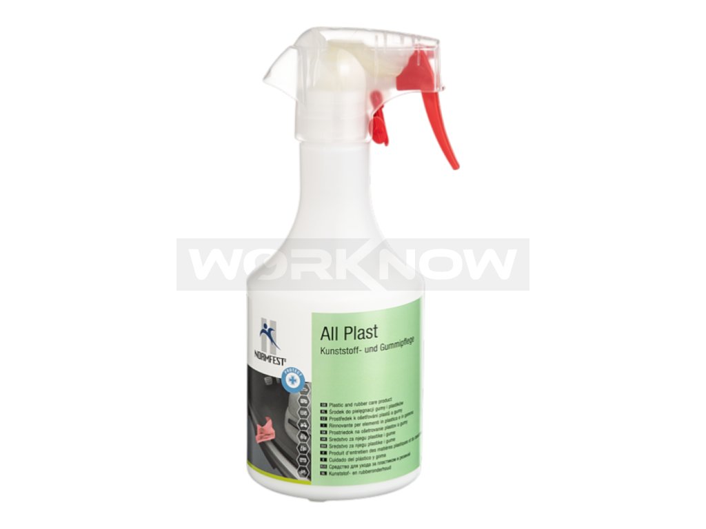 All Plast je prostředek na péči na bázi vody a silikonu pro plasty a gumy v interiérech i exteriérech vozidel. Inovativní složení má vysoký stupeň krytí, je rychle schnoucí a zanechává nelepivý povrch. Ošetřené povrchy, jako jsou plasty a gumy, dostávají nový, dlouhodobý a temně černý vzhled. Je ideální pro přípravu a údržbu plastů, těsnění, gumových obložení a gumových hadic. Použití na gumových těsnění v zimním období zabraňuje zamrznutí a usnadňuje otevírání dveří.