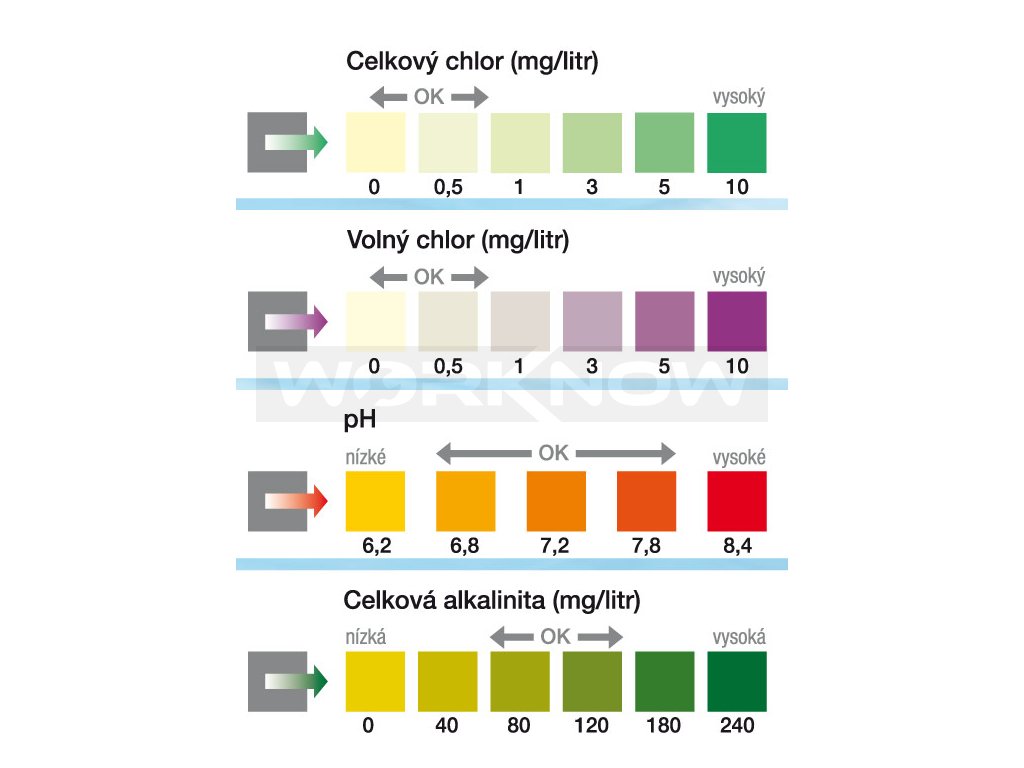 Je identifikační proužek pro zjišťování celkového i volného chlóru, pH a celkové alkalinity.Ponořte proužek do vody a ihned jej vyjměte. Držte proužek 15 vteřin (nesetřepávejte zbytky vody z proužku) a potom porovnejte barvu políčka pro celkový chlór, volný chlór, pH a celkovou alkalinitu s barevnou škálou na etiketě obalu.