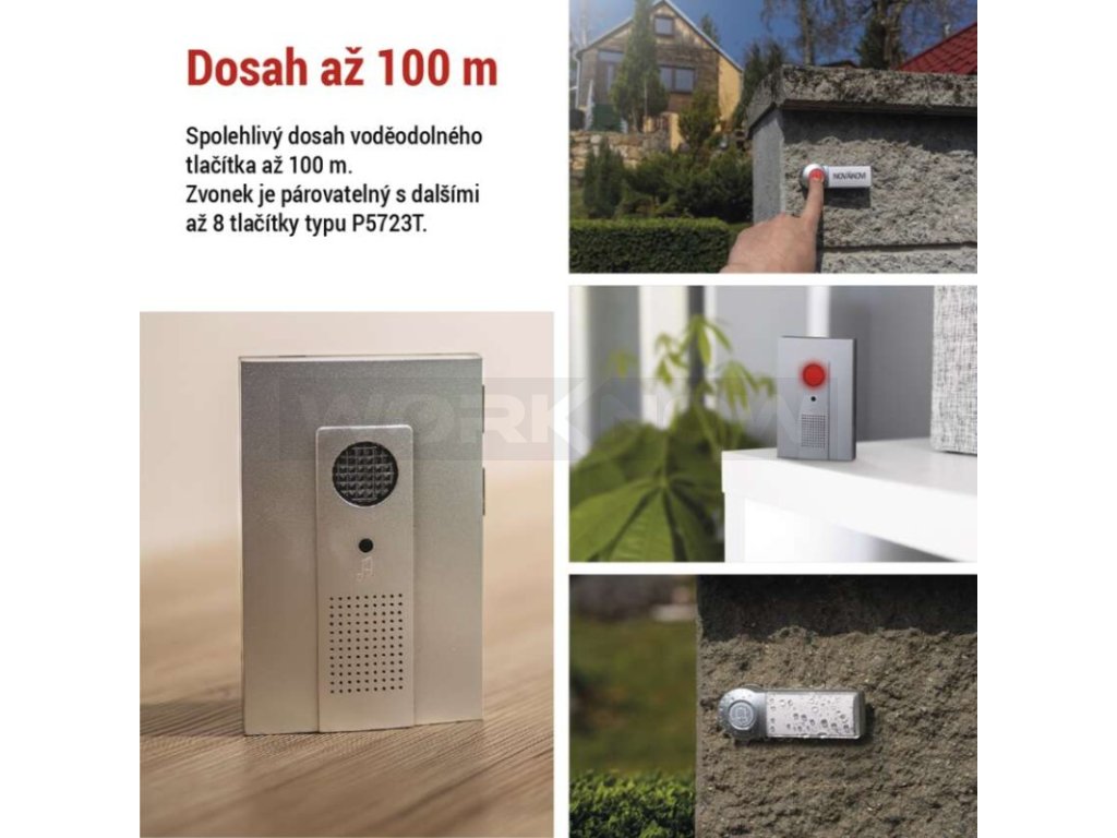 Zvonek P5712 je vybaven voděodolným tlačítkem a zvládne tedy i nejrůznější rozmary počasí. Umístit jej tak můžete k brance, na nekrytou část domu, nebo třeba na plot.