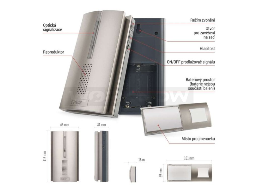 napájení hlavní jednotky: 3× 1,5 V AA (nejsou součástí balení)