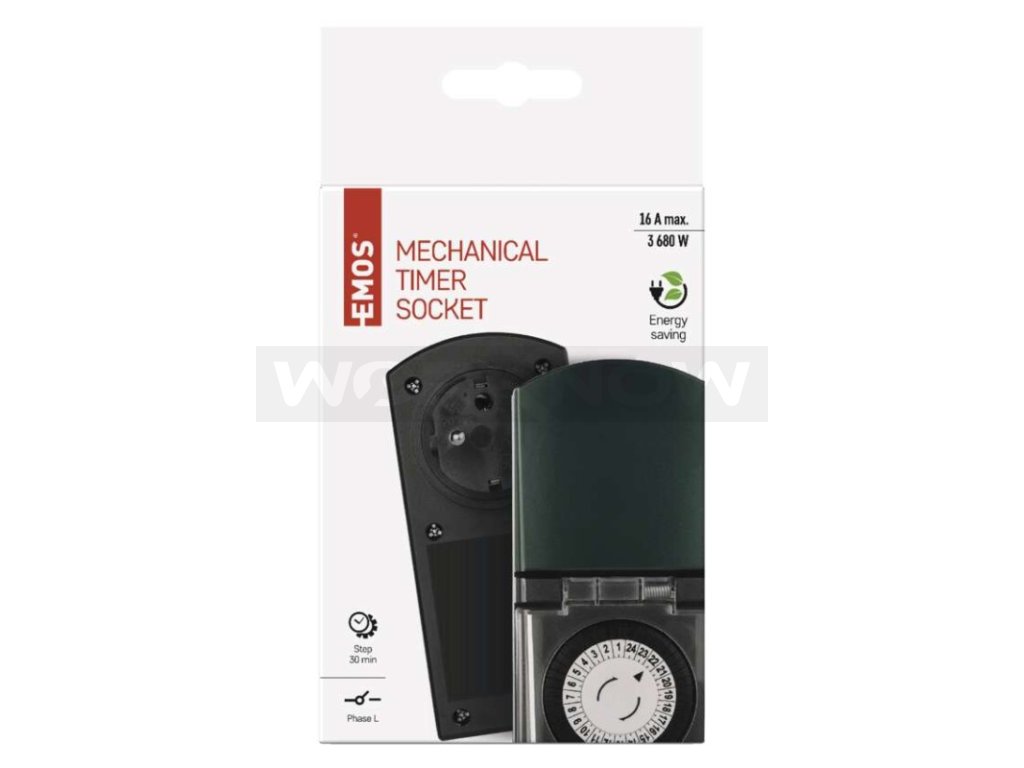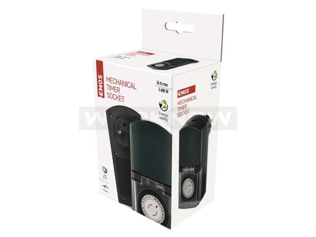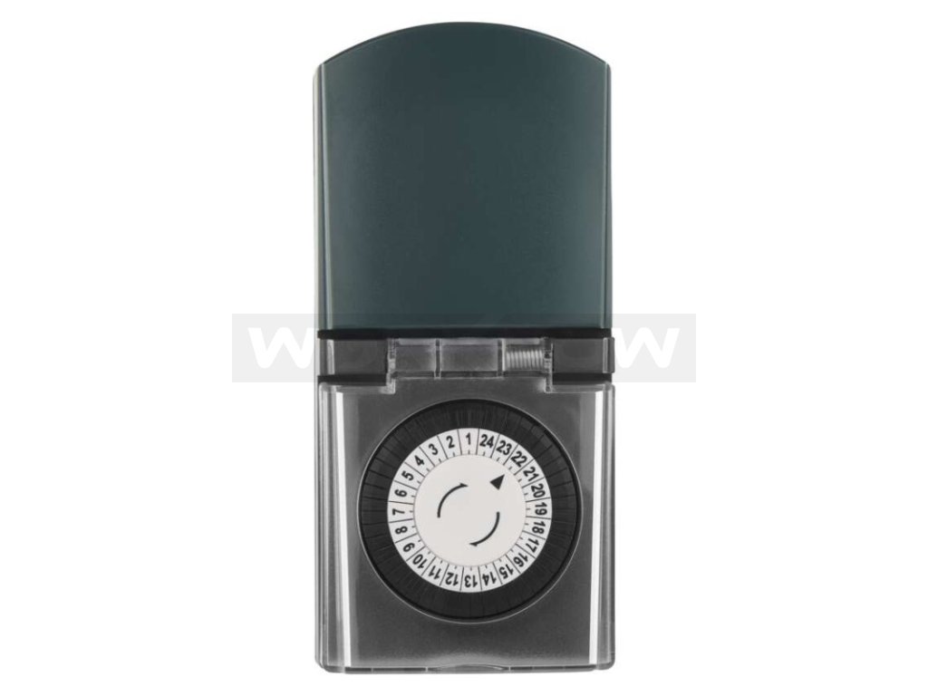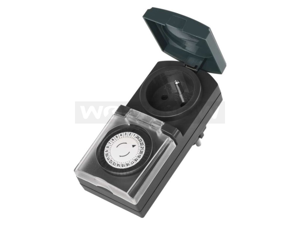 Mechanická spínací zásuvka s 24hodinovým cyklem. Minimální nastavitelný časový úsek je 30 minut. Krytí IP44 umožňuje použití mechanické spínací zásuvky ve venkovních prostorech. Provozní teplota -25 °C do +50 °C.