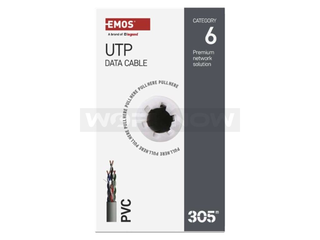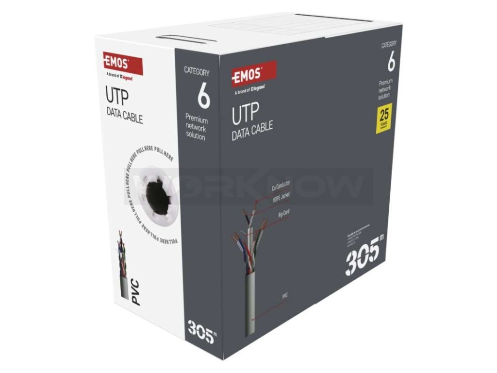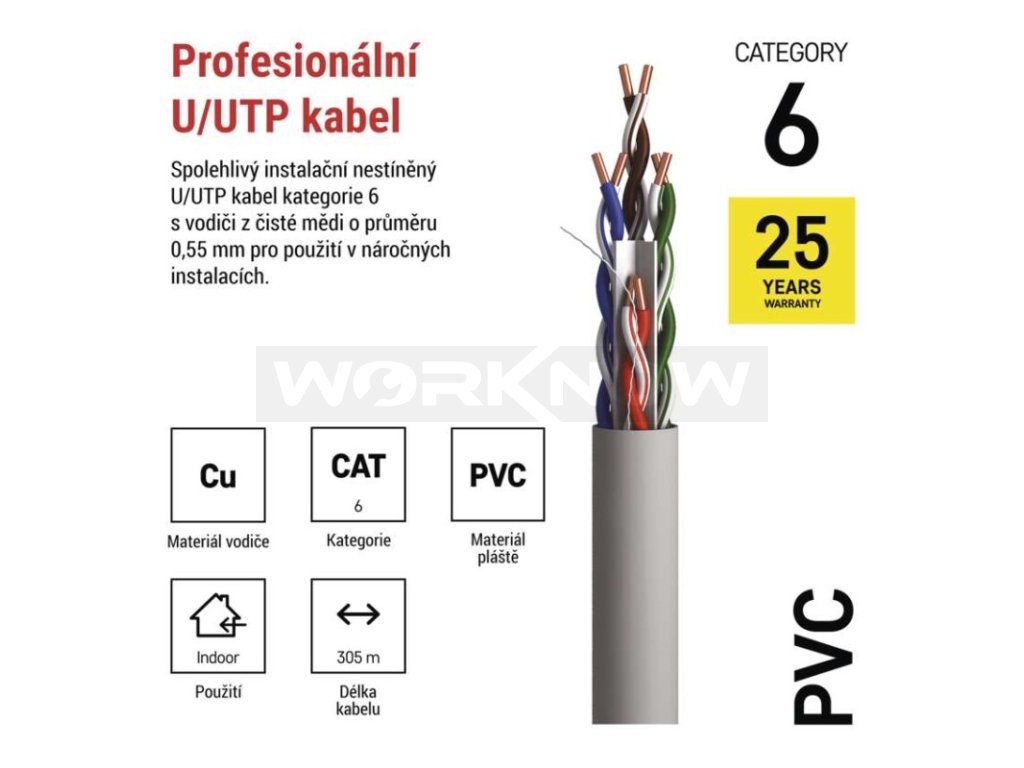 Nestíněný horizontální kabel nejvyšší kvality kategorie CAT6 s PVC pláštěm. Jádra vodičů vyrobeny z nerecyklované mědi. Kabel splňuje požadavky směrnice CPR o stavebních výrobcích.