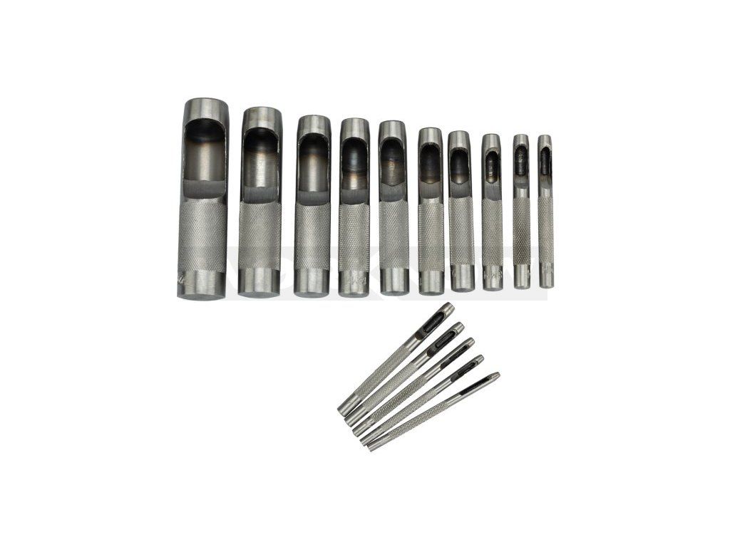 Ocelové děrovače na kůži. Děrovače jsou opatřeny bočním výhozem odpadu. Sada 15ks. Průměry děrovačů: 2mm, 2,5mm, 3,2mm, 4mm, 4,8mm, 5mm, 6,4mm, 8mm, 9,5mm, 11,1mm, 12,7mm, 14mm, 15,8mm, 19mm, 22mm.