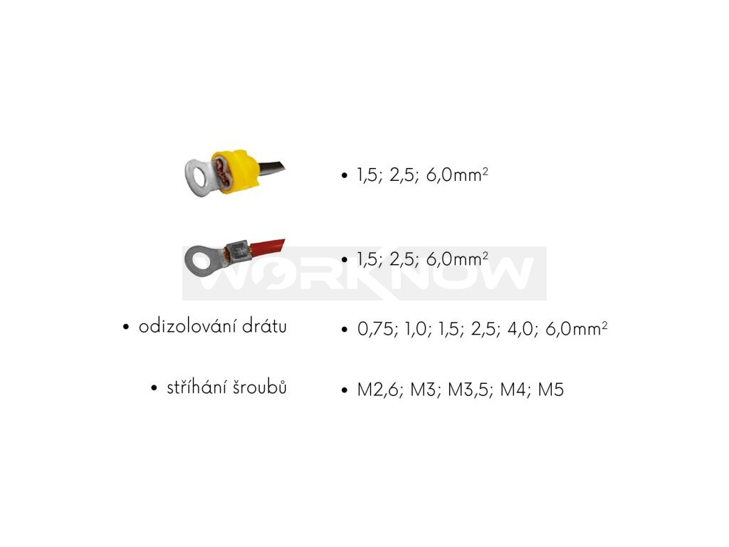 - izolované koncovky 1.5, 2.5, 6.0 mm / neizolované koncovky 1.5, 2.5, 6.0 mm / střih metrickým šroubů M2.6, M3, M3.5, M4 a M5 / odizolovávání 0.75, 1.0, 1.5, 2.5, 4.0 a 6.0 mm + B16 : B19