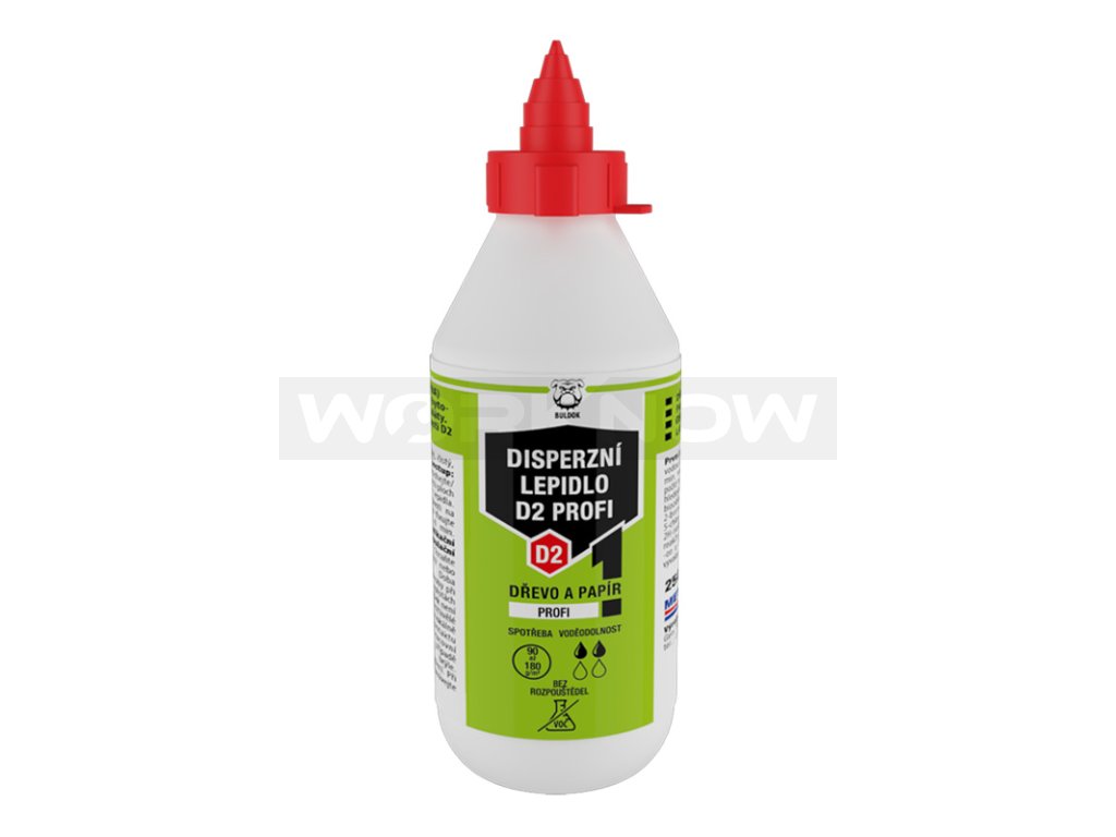 Disperzní PVA lepidlo se zvýšenou odolností proti vlhkosti D2. Ideální pro měkké i tvrdé dřevo v interiéru, výrobě nábytku a papírenského průmyslu.Produkt lze využít při výrobě nábytku a bytových doplňků ze dřeva, montážních pracích, kde je zapotřebí slepit kolíkové a zubové spoje nebo v papírenském průmyslu. Lepidlo vytváří vysoce elastický průhledný spoj, který vzdoruje zvýšené vlhkosti nebo občasnému a krátkodobému působení vody - kategorie D2 (ČSN EN 204). Výrobek neobsahuje rozpouštědla ani ftaláty a je mísitelný s vodou.