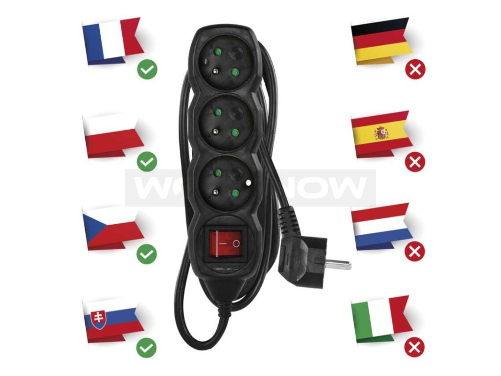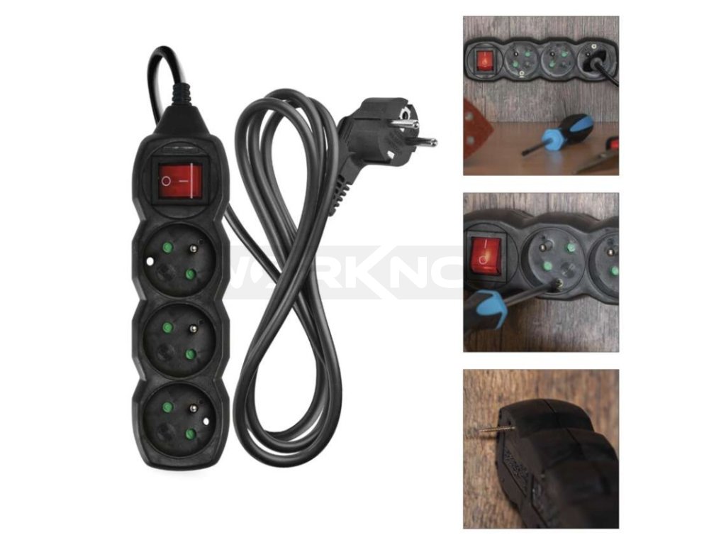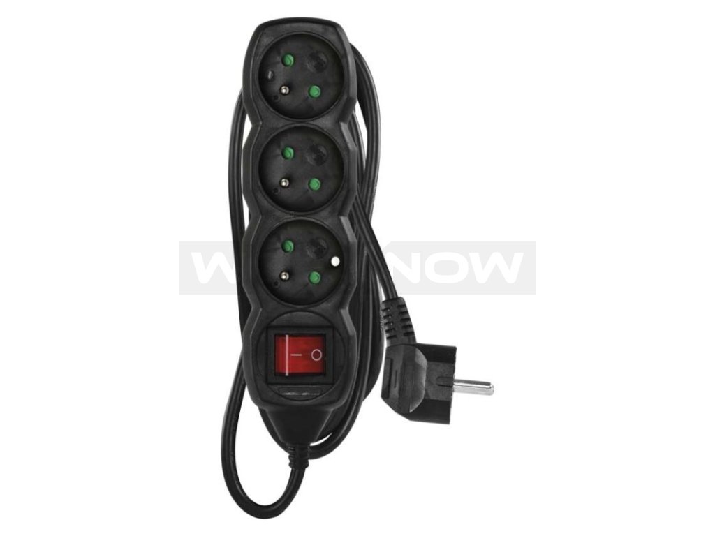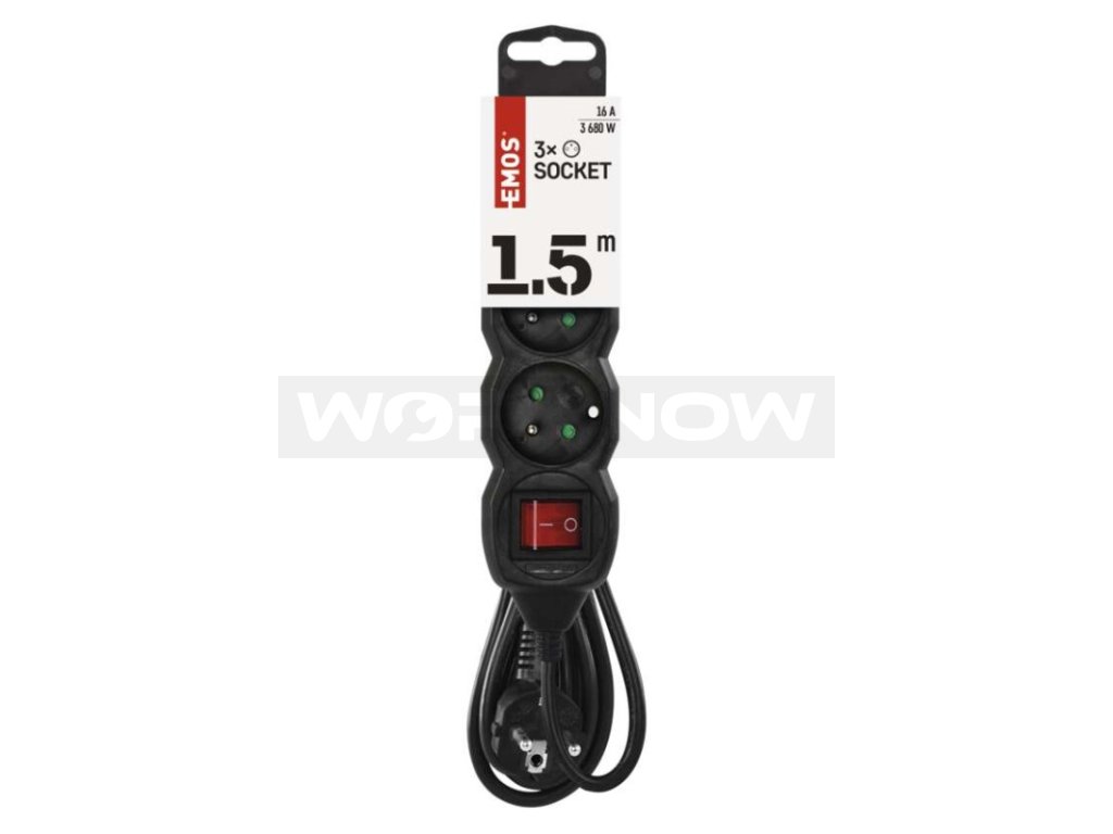 Černý prodlužovací přívod, 3 zásuvka s vypínačem, délkou 1,5 m a průřezem vodiče 1 mm2. Vhodný pro maximální zátěž 16 A max.