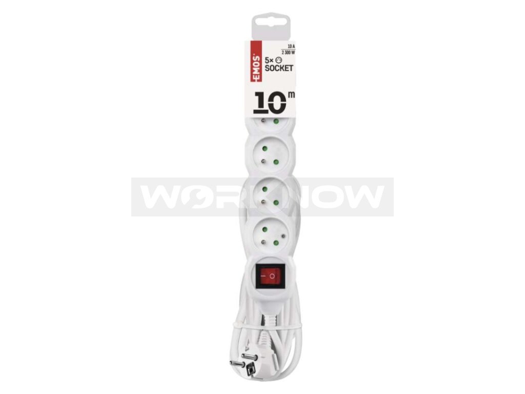 Prodlužovací kabel 10 m / 5 zásuvek / s vypínačem / bílý / PVC / 1 mm2
