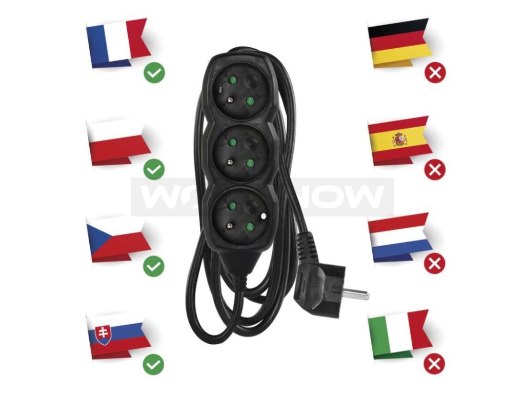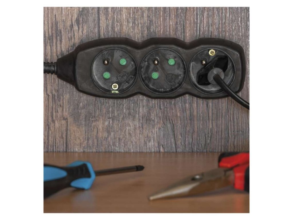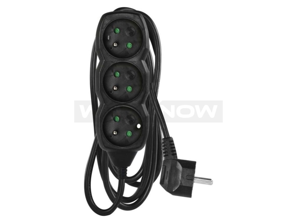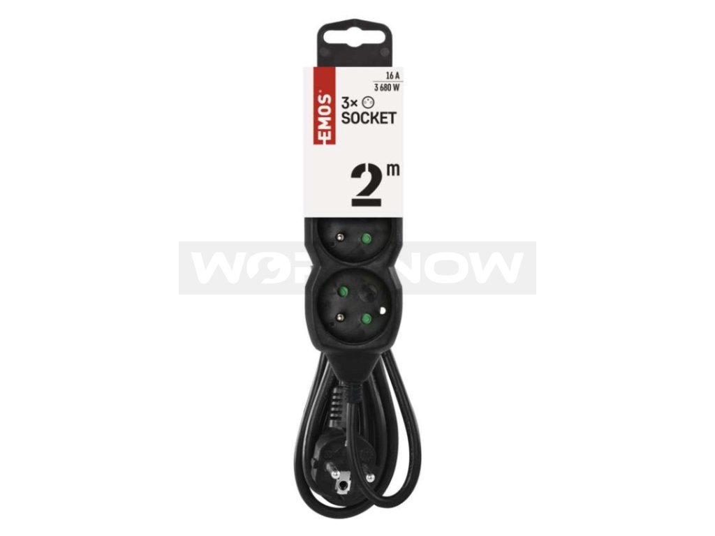 Černý prodlužovací přívod, 3 zásuvka s délkou 2 m a průřezem vodiče 1 mm2. Vhodný pro maximální zátěž 16 A max. Montážní otvory pro přichycení zásuvky na zeď.