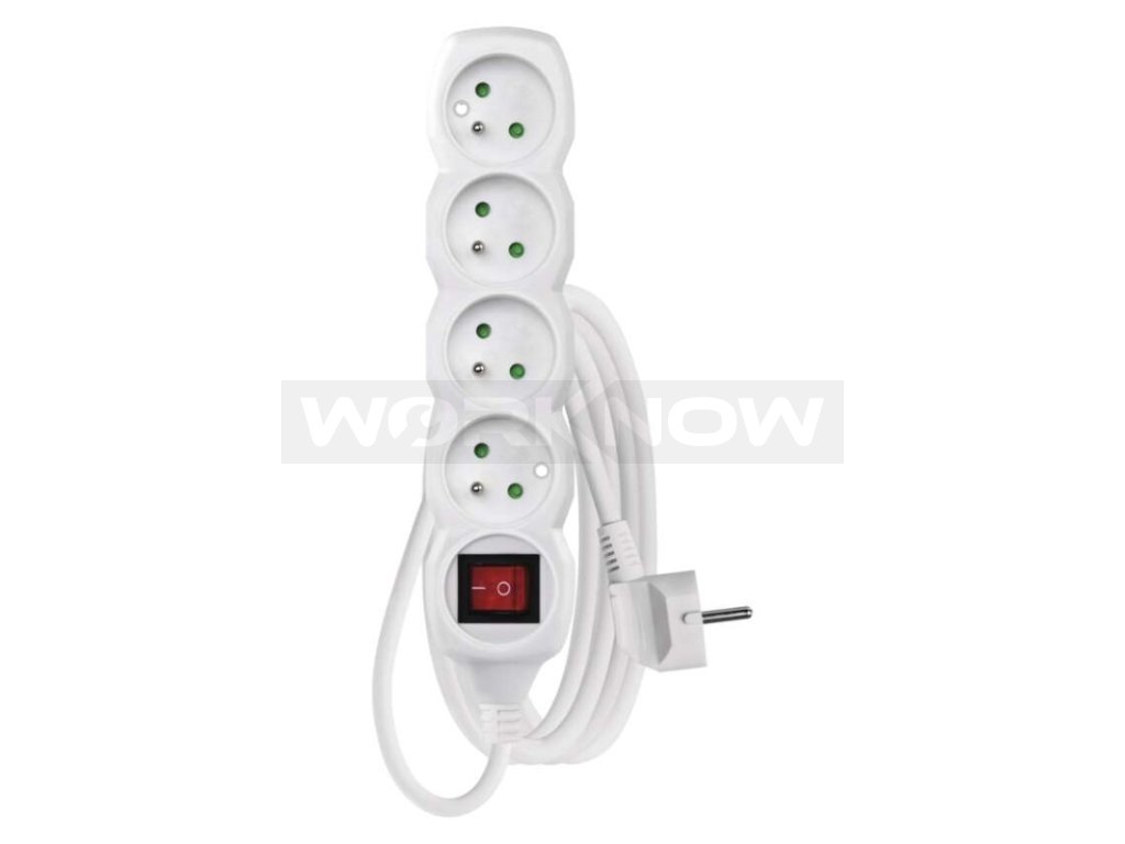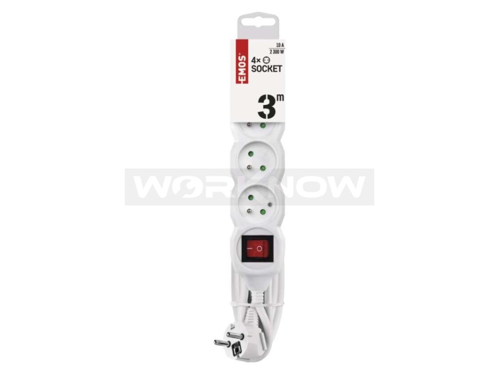 Bílý prodlužovací přívod, 4 zásuvka s vypínačem, délkou 3 m a průřezem vodiče 1 mm2. Vhodný pro maximální zátěž 10 A max.