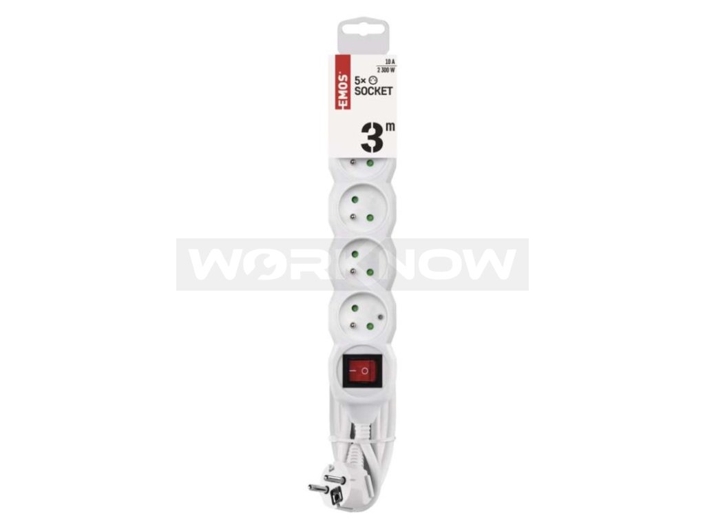 Bílý prodlužovací přívod, 5 zásuvka s vypínačem, délkou 3 m a průřezem vodiče 1 mm2. Vhodný pro maximální zátěž 10 A max.