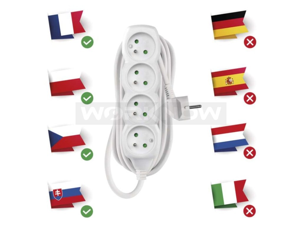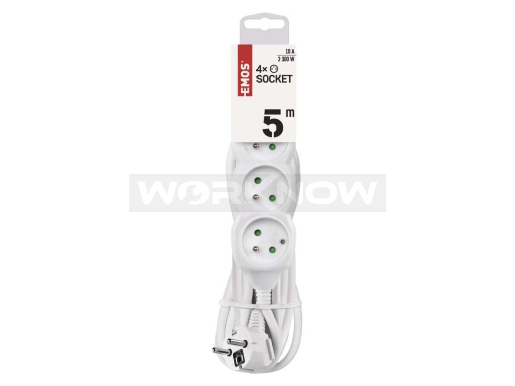 Bílý prodlužovací přívod, 4 zásuvka s délkou 5 m a průřezem vodiče 1 mm2. Vhodný pro maximální zátěž 10 A max.
