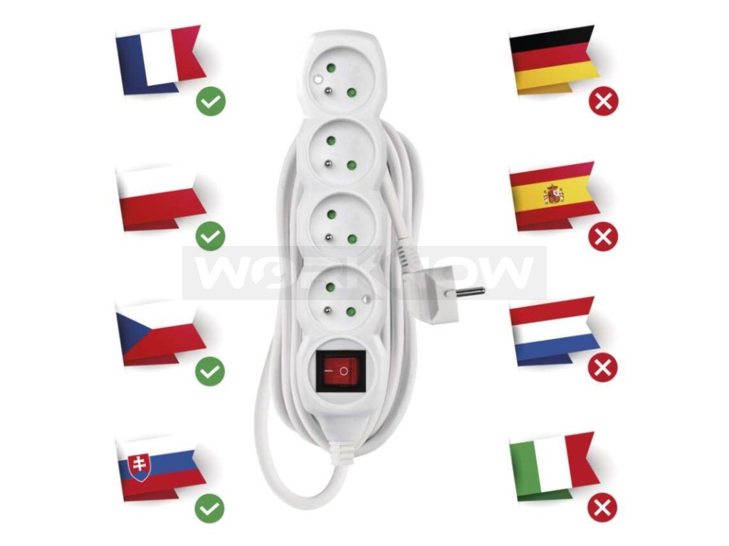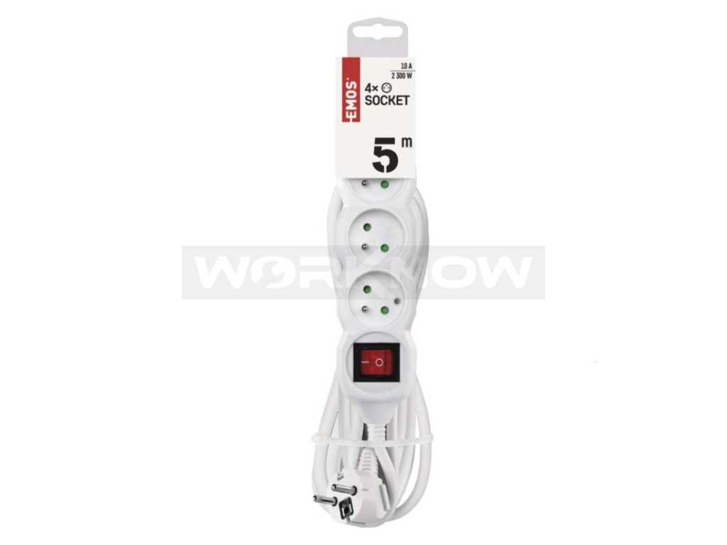 Bílý prodlužovací přívod, 4 zásuvka s vypínačem, délkou 5 m a průřezem vodiče 1 mm2. Vhodný pro maximální zátěž 10 A max.