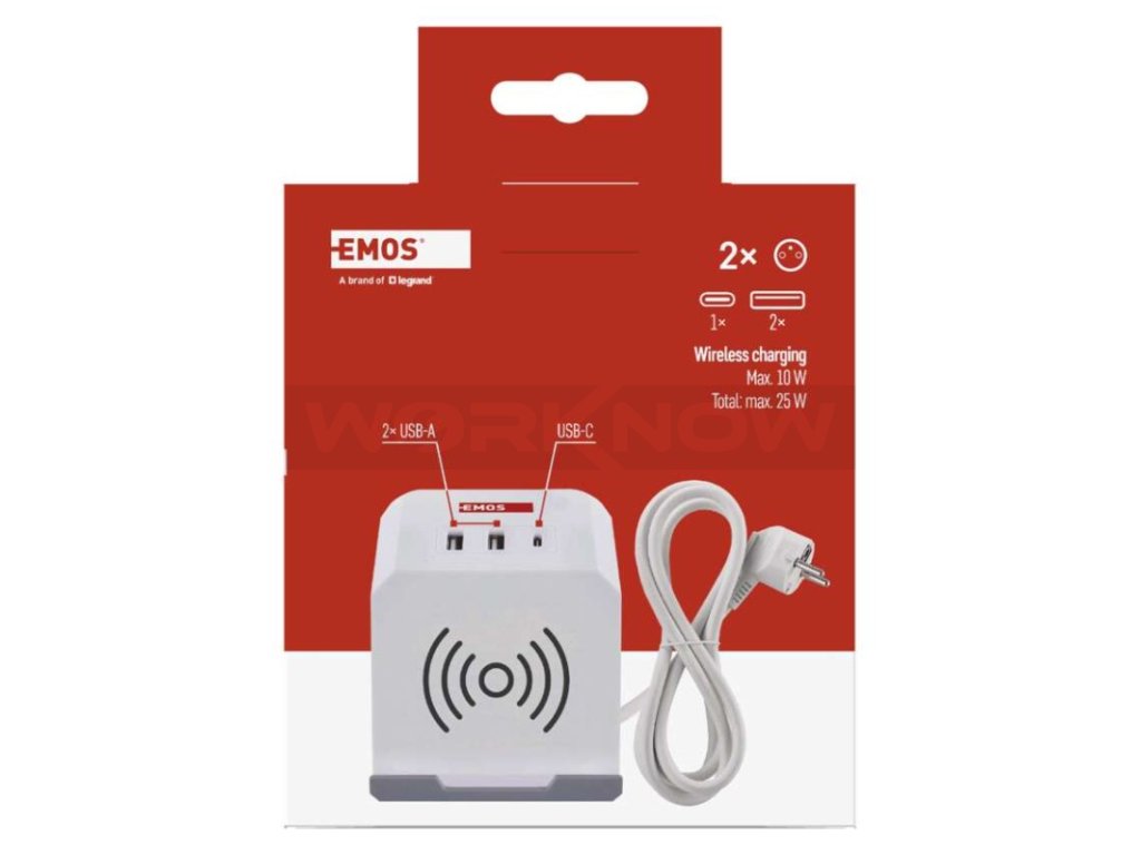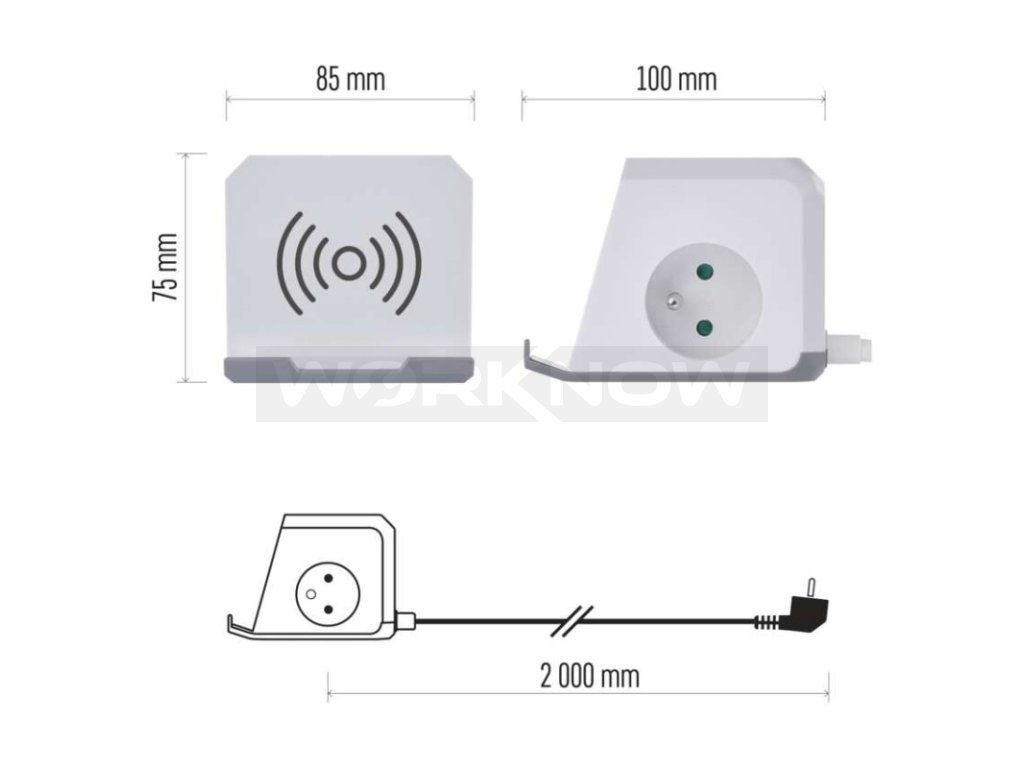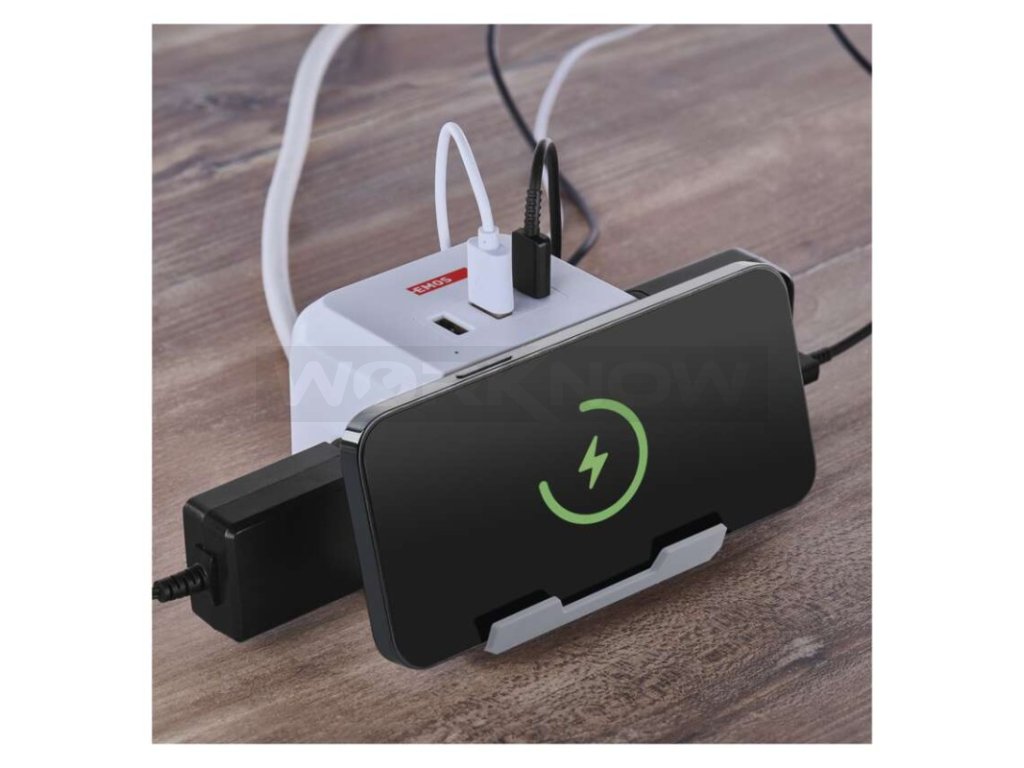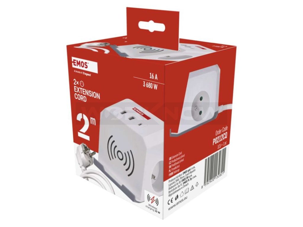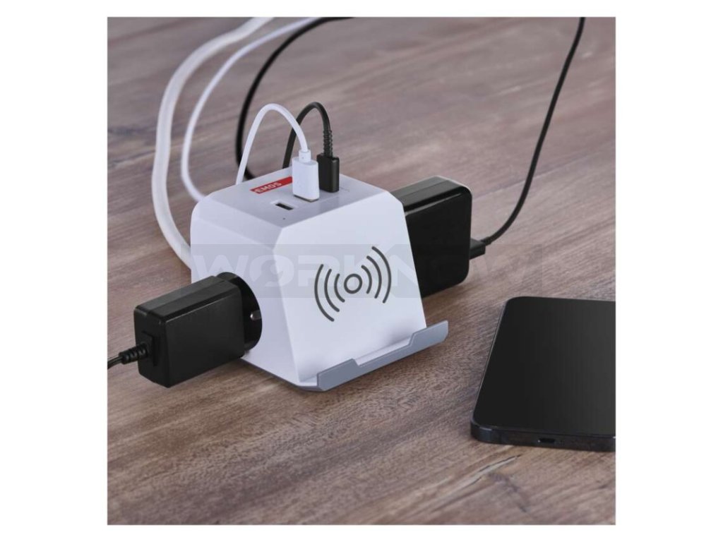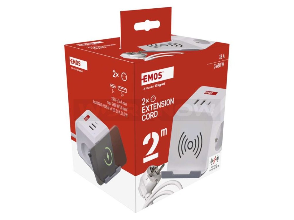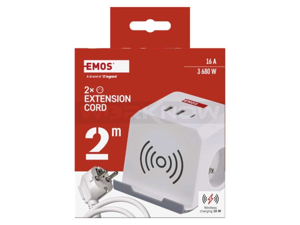 Kompaktní a praktický prodlužovací přívod s bezdrátovou nabíječkou 10 W. 250V~/16A max. 2 zásuvky s dětskými clonkami. USB 2×A+1×C 3 A, 15 W max. Délka přívodního kabelu 2 m. Vodič H05VV-F3G 1,5mm2.