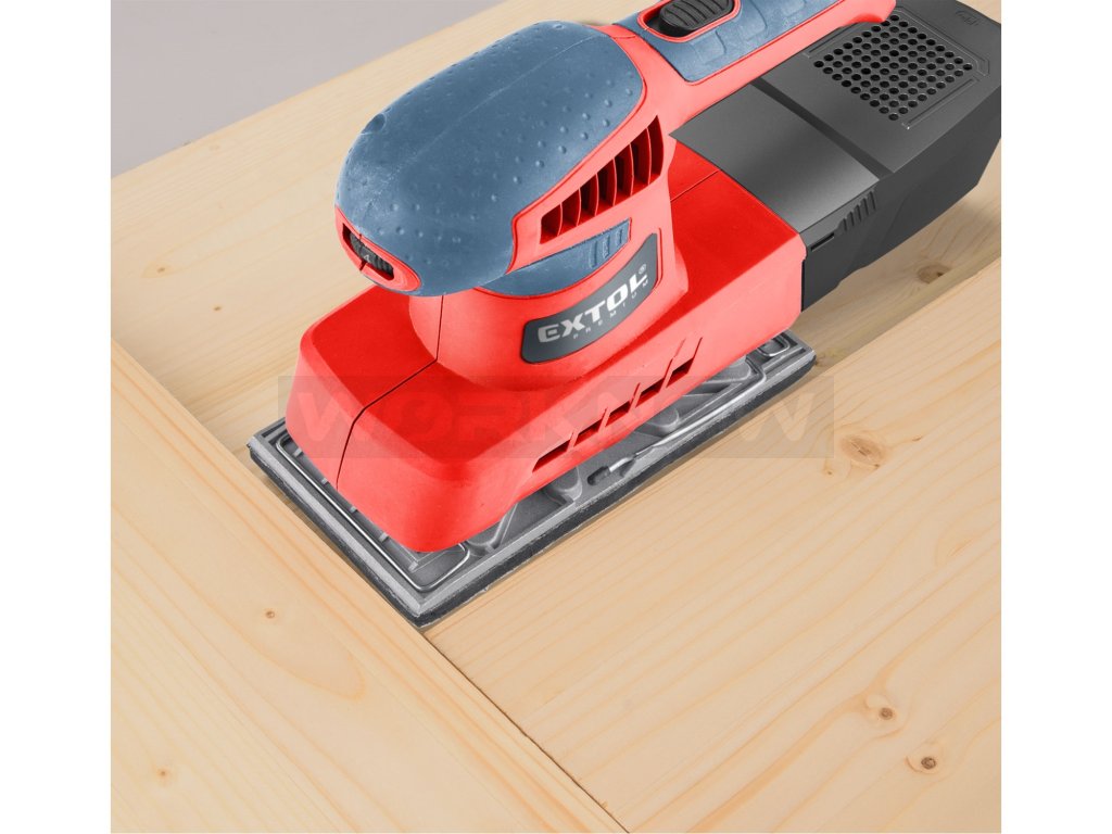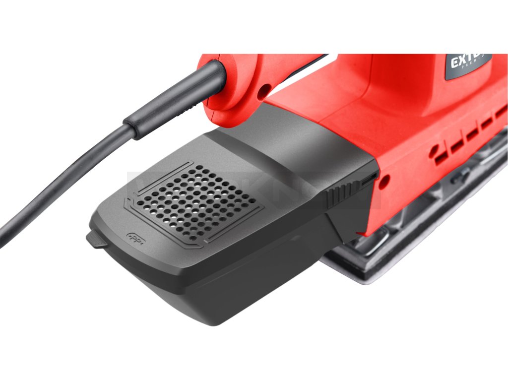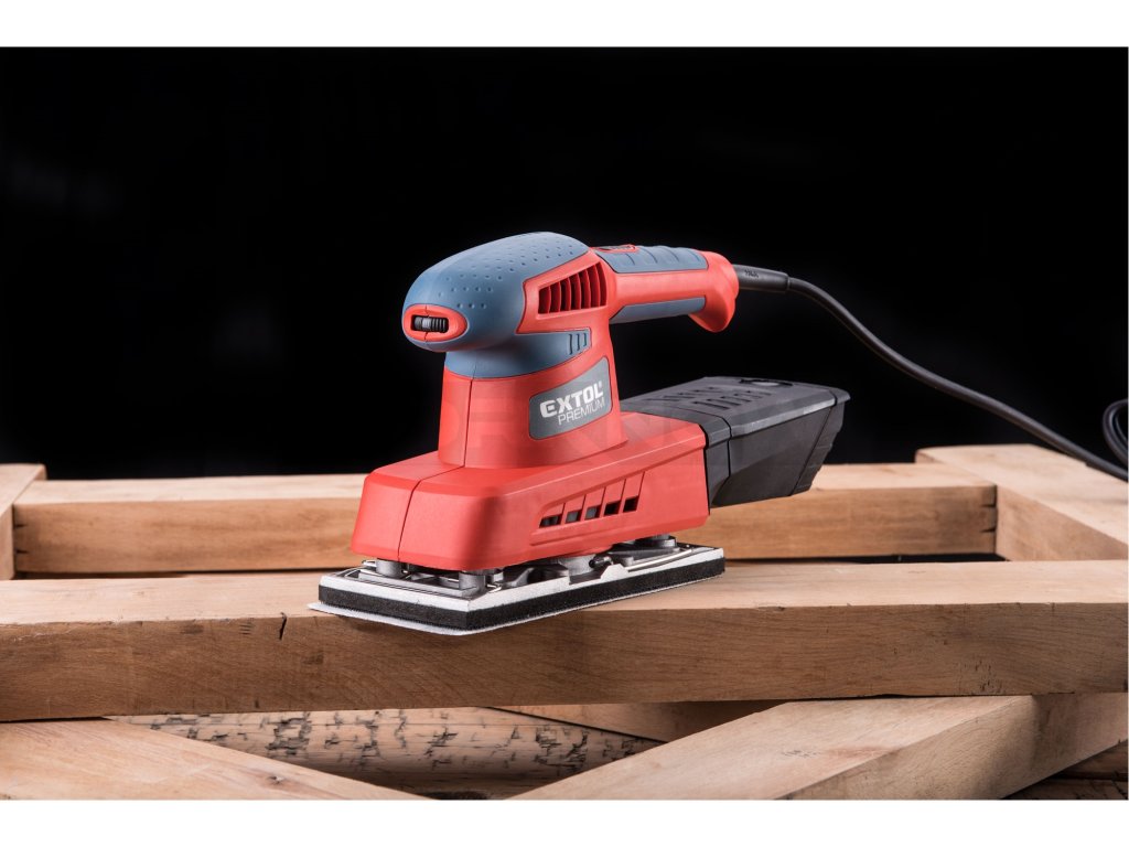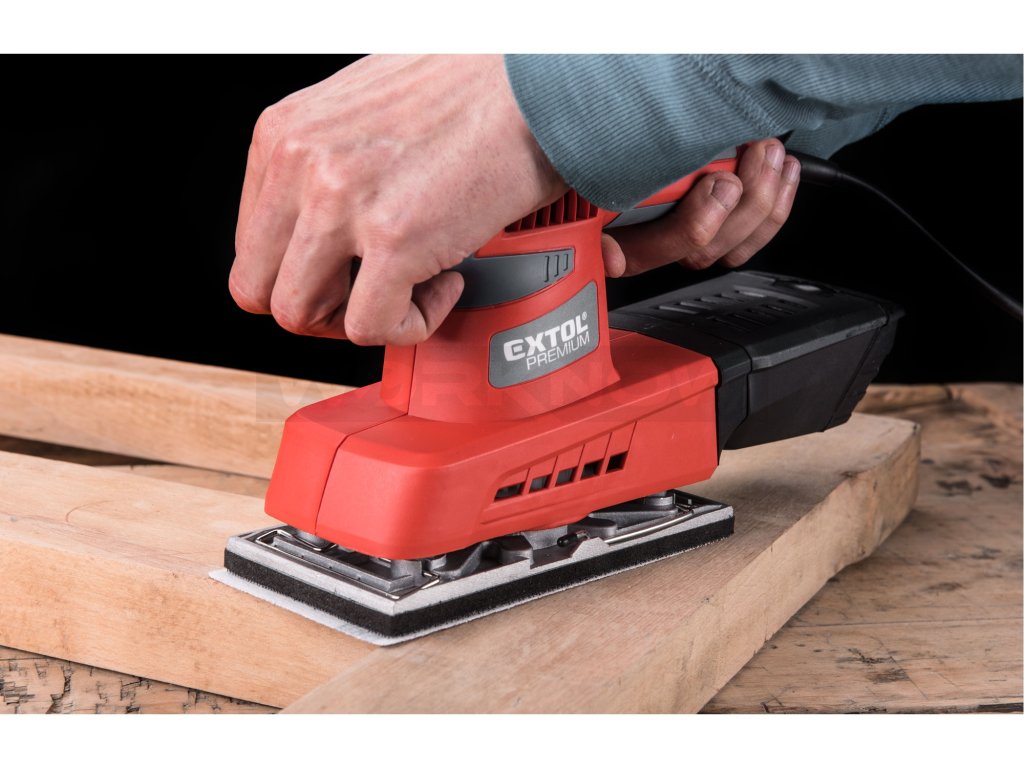 Dvouruční výkonná bruska pro plošné a rohové broušení plochých dřevěných materiálů, kovů, plastů, tmelů a laků. Při broušení si můžete upravit rychlost dle typu broušeného materiálu. Z důvodu delší životnosti má bruska pevnou kovovou základnu na kterou lze přichytit brusné papíry pomocí suchého zipu nebo svorkami. Čistý pracovní prostor zajišťuje integrovaný systém odsávání pilin do sběrného boxu. Horní strana rukojeti je pokryta gumou, která tlumí přenos vibrací při práci.Není vhodná pro broušení sádrokartonu.- elektronická regulace rychlosti