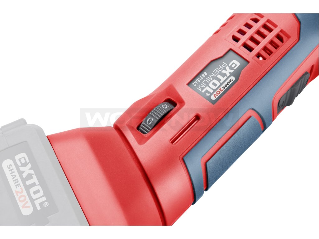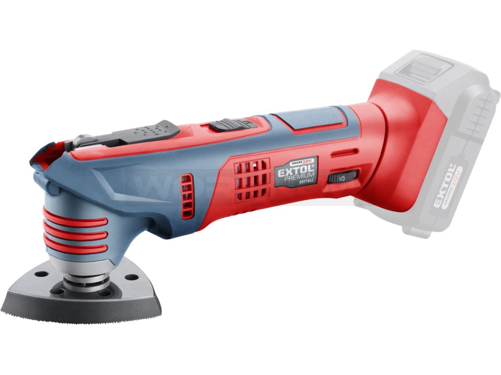 Aku multifunkční bruska je určena k řezání a oddělování dřevěných materiálů, umělé hmoty, sádrokartonu a měkkých kovů (např. mědi, hliníku, nekalených hřebíků, slitin měkkých kovů) dále k rašplování, broušení a seškrabávání menších ploch. Nářadí umožňuje provádět přesné práce na těžko přístupných místech jako např. provádění výřezů v rozích nábytku, obkladaček apod. Její hlavní výhodou je akumulátorový pohon, který dovoluje si vzít brusku s sebou tam kde s ním potřebujete pracovat, bez ohledu na to, jestli tam je rozvod elektrické energie. Pro běžnou práci dostačují jeden nebo dva 2000mAh akumulátory, které můžete rychle nabít v rychlonabíječce, pro náročnější nebo delší práci doporučujeme větší akumulátory s kapacitou 4000–8000mAh. Akumulátor lze použít ve všech typech nářadí řady EXTOL SHARE20V. Díky použité Li-ion technologii je ho možné kdykoliv dobíjet, aniž by se tím snižovala jeho kapacita. Li-ion akumulátor ztrácí energii vlivem samovybíjení velmi pomalu a vydrží dlouho nabitý a připravený k použití.- rychloupínací čelist zajišťuje snadnou beznástrojovou výměnu břitů "quick install"