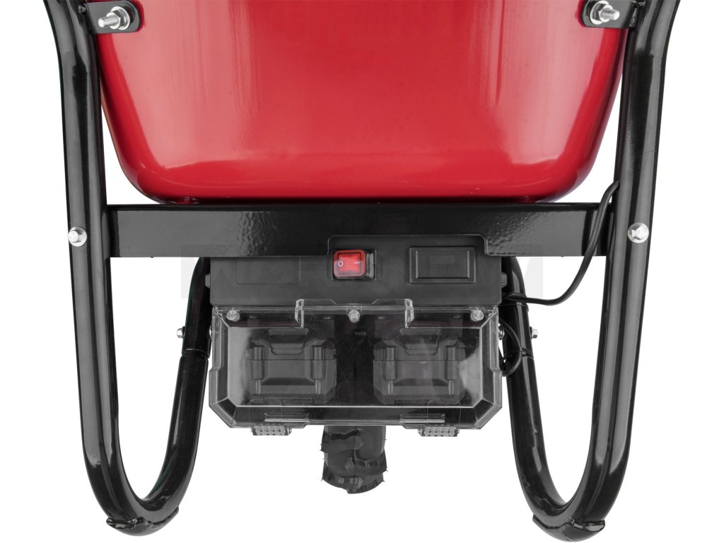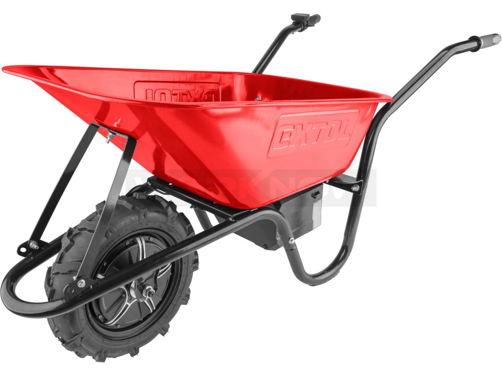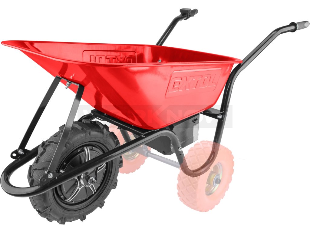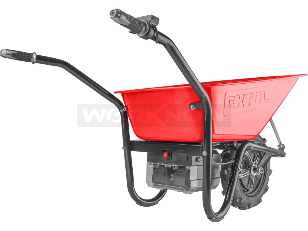 Přepravní aku kolečko s pomocným elektrickým pohonem je určeno pro přepravu tuhých, sypkých nebo hustých materiálů. Díky elektrickému pohonu se výrazně urychlí přeprava materiálu a zároveň sníží únava obsluhy, což významně zvýší produktivitu práce. Použití Li-ion baterie výrazně snižuje hmotnost kolečka oproti kolečkům, které jsou poháněny olověnými bateriemi. Kolečko má na pravé rukojeti ovládací panel a pomocí palce si může nastavit okamžitou rychlost jak do předu, tak dozadu. Na ovládacím panelu lze nastavit jízdu dopředu nebo dozadu, brzdu, normální rychlost nebo Turbo. Pro běžný provoz se používá normální rychlost, Turbo lze použít při jízdě do kopce, v obtížném terénu nebo při přepravě těžšího nákladu. Kolečka jsou poháněná nejmodernějším „brushless" motorem. Tento nový typ motoru má vyšší životnost, je výkonnější a má menší spotřebu el. energie než klasické motory s uhlíkovými kartáči. Pokud je to nutné, lze motor kompletně vypnout a používat kolečko jen na ruční pohon. Elektrická brzda se používá pokud potřebujete zamezit pohybu kolečka na místě. Pneumatika má hluboký vzorek do terénu. Kolečko je dodáváno s kovovou korbou o objemu 80l, bezešvě lisovanou z jednoho kusu plechu. Pro přepravu lehčího a objemného nákladu lze dokoupit samostatně prodávanou plastovou korbu o objemu 100l. Všechny náhradní korby mají předvrtané díry pro snadnou montáž. Kolečko má krytí IP64, což mu umožňuje dočasnou práci ve vlhkém prostředí, případně umývání vapkou, ale není určeno k trvalému provozu nebo skladování ve vlhkém prostředí. Zdrojem elektrické energie jsou silné SHARE20V akumulátory, které se prodávají samostatně. Z důvodu vysokého odběru je nutné použít 6-8Ah verzi. Výhodou použití SHARE20V baterií je, že když nepoužíváte kolečko, můžete je také používat v našem neustále rozšiřujícím se sortimentu nářadí používajícího SHARE20V baterie. Vyjímatelné baterie umožňují jejich snadné nabíjení a skladování v suchém a zatepleném prostředí, což je velmi důležité pro jejich životnost. Baterie mají ochranu proti vybití pod minimální úroveň, před přetížením při nadměrném odběru proudu, přebitím, zkratem a náhlému zvýšení teploty při práci. Díky použité Li-ion technologii je ho možné kdykoliv dobíjet, aniž by se tím snižovala jeho kapacita. Li-ion akumulátor ztrácí energii vlivem samovybíjení velmi pomalu a vydrží dlouho nabitý a připravený k použití.- silný 500W motor