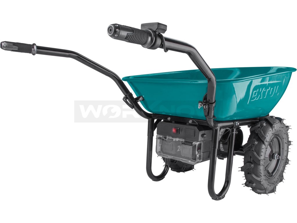 Přepravní aku kolečko dvoukolák s pomocným elektrickým pohonem je určeno pro přepravu tuhých, sypkých nebo hustých materiálů. Díky elektrickému pohonu výrazně urychluje přeprava materiálu a zároveň snižuje únava obsluhy, což významně zvyšuje produktivitu práce. Použití Li-ion baterie výrazně snižuje hmotnost kolečka oproti kolečkům, které jsou poháněny olověnými bateriemi. Kolečko má na pravé rukojeti ovladač kde si pomocí palce nastavíte okamžitou rychlost jak do předu, tak dozadu. Na ovladači lze přepnout jízdu dopředu nebo dozadu, brzdu, normální rychlost nebo Turbo. Pro běžný provoz se používá normální rychlost, Turbo lze použít při jízdě do kopce, v obtížném terénu nebo při přepravě těžšího nákladu. Kolečka jsou poháněná nejmodernějším „brushless" motorem. Tento nový typ motoru má vyšší životnost, je výkonnější a má menší spotřebu el. energie než klasické motory s uhlíkovými kartáči. Pokud je to nutné, lze krátkodobě používat kolečko bez baterie jen na ruční pohon. Zabudovaná převodovka s diferenciálem výrazně zlepšuje prostupnost terénem a výkon motoru při jízdě do kopce. Diferenciál umožňuje otočení koleček na místě. Díky umístnění těžiště nákladu nad osou kol je většina hmotnosti nákladu umístěna na kolech a obsluha skoro nic nenese. Elektrická brzda se používá pokud potřebujete zamezit pohybu kolečka na místě. Pneumatiky mají hluboký vzorek do terénu s dobrou trakcí. Kolečko je dodáváno s kovovou korbou o objemu 100l, bezešvě lisovanou z jednoho kusu plechu. Pro přepravu pevného objemnějšího nákladu (např. krabice, polena …) lze dokoupit rámovou konstrukci, která se přišroubuje na místo korby. Kolečko má krytí IP64, což mu umožňuje dočasnou práci ve vlhkém prostředí, případně umývání vapkou, ale není určeno k trvalému provozu nebo skladování ve vlhkém prostředí. Před přepravou v autě můžete sklopit ručky, takže se kolečka vejdou i do menšího auta. Zdrojem elektrické energie jsou silné SHARE20V akumulátory, které se prodávají samostatně. Z důvodu vysokého odběru je nutné použít 6-8Ah verzi. Výhodou použití SHARE20V baterií je, že když nepoužíváte kolečko, můžete je také používat v našem neustále rozšiřujícím se sortimentu nářadí používajícího SHARE20V baterie. Vyjímatelné baterie umožňují jejich snadné nabíjení a skladování v suchém a zatepleném prostředí, což je velmi důležité pro jejich životnost. Baterie mají ochranu proti vybití pod minimální úroveň, před přetížením při nadměrném odběru proudu, přebitím, zkratem a náhlému zvýšení teploty při práci. Díky použité Li-ion technologii je ho možné kdykoliv dobíjet, aniž by se tím snižovala jeho kapacita. Li-ion akumulátor ztrácí energii vlivem samovybíjení velmi pomalu a vydrží dlouho nabitý a připravený k použití.- silný 500W motor s převodovkou a diferenciálem