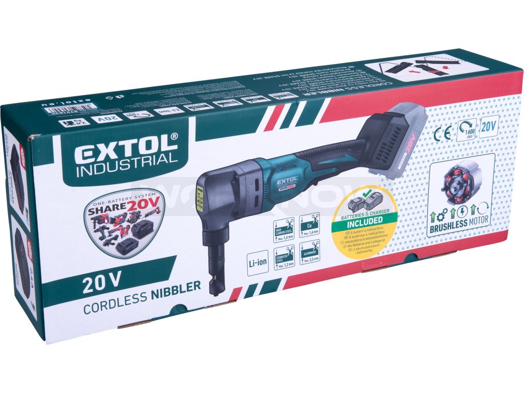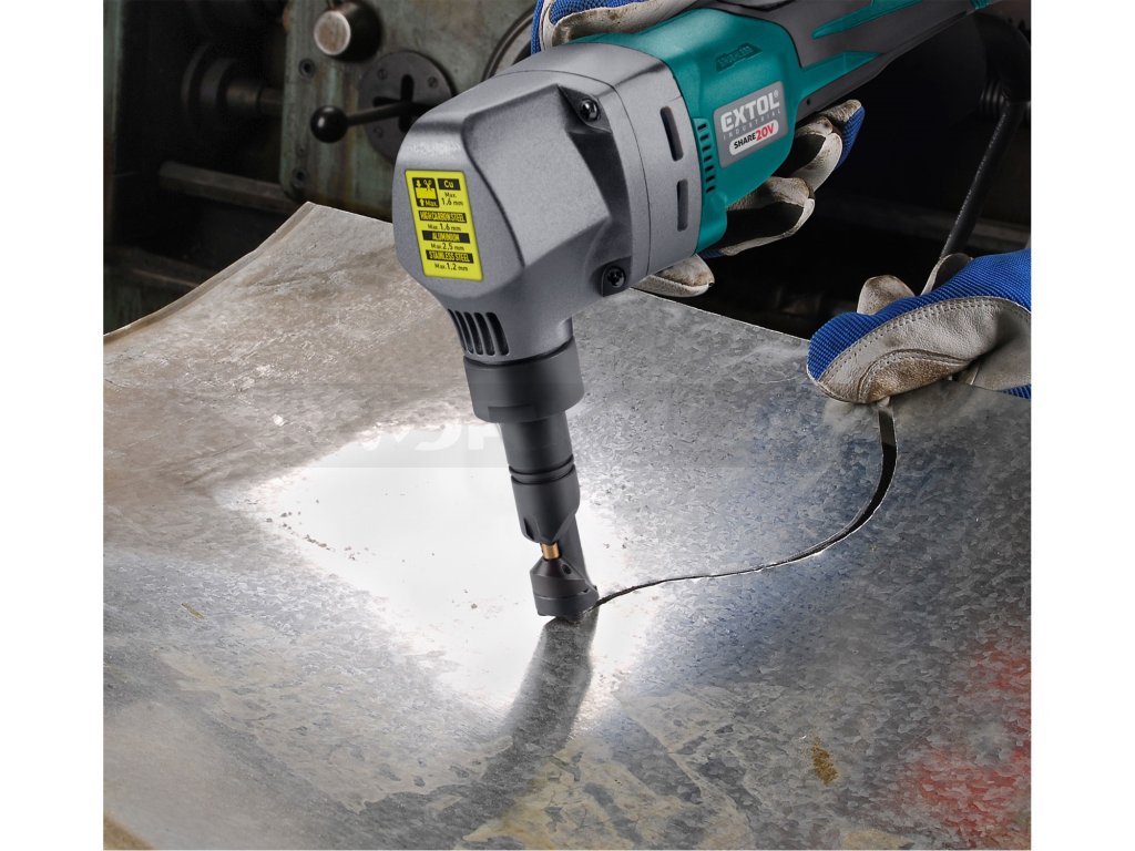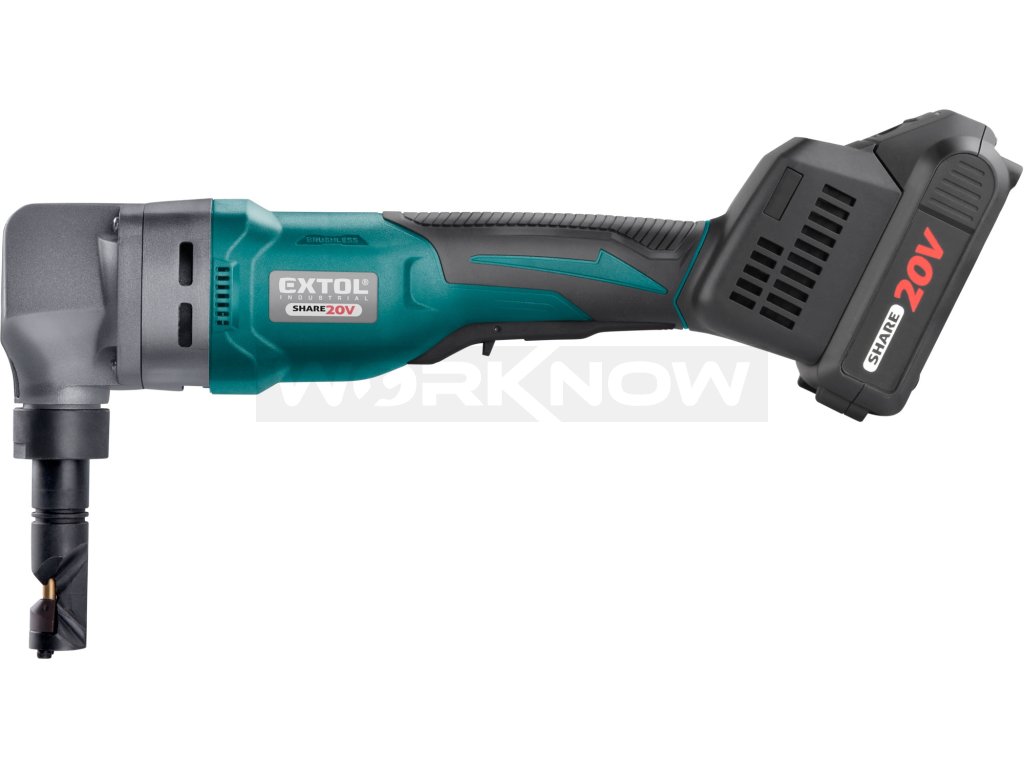 Aku nůžky na plech jsou určeny pro snadné vystřihování plochého, vlnitého a lichoběžníkového plechu bez zkroucení a deformace hran. Nůžky jsou poháněny nejmodernějším „brushless” motorem. Tento nový typ motoru má vyšší životnost, je výkonnější a má menší spotřebu el. energie než klasické motory s uhlíkovými kartáči. Díky absenci kabelu je práce s nimi pohodlnější, zejména na místech, kde by manipulace s kabelem byla obtížná nebo nebezpečná. Aku nůžky jsou ideální volbou pro profesionály v oblasti stavebnictví, klempířství nebo údržby, ale také pro kutily, kteří potřebují provádět přesné a čisté řezy. S matricí otočnou o 360° lze vystřihovat libovolné tvary. Minimální kružnice kterou lze vystřihnout má průměr 75mm. Pro snadné a bezpečné ovládání jsou nůžky vybaveny dlouhým “pádlovým” spínačem s pojistkou proti náhodnému stisknutí. Díky úzkému tělu se snadno drží v ruce. Pro běžnou práci dostačují jeden nebo dva 2Ah akumulátory, které můžete rychle nabít v rychlonabíječce, pro náročnější nebo delší práci doporučujeme větší akumulátory s kapacitou 4–8Ah. Akumulátor lze použít ve všech typech nářadí řady EXTOL SHARE20V. Díky použité Li-ion technologii je ho možné kdykoliv dobíjet, aniž by se tím snižovala jeho kapacita. Li-ion akumulátor ztrácí energii vlivem samovybíjení velmi pomalu a vydrží dlouho nabitý a připravený k použití.- stříhání profilového plechu