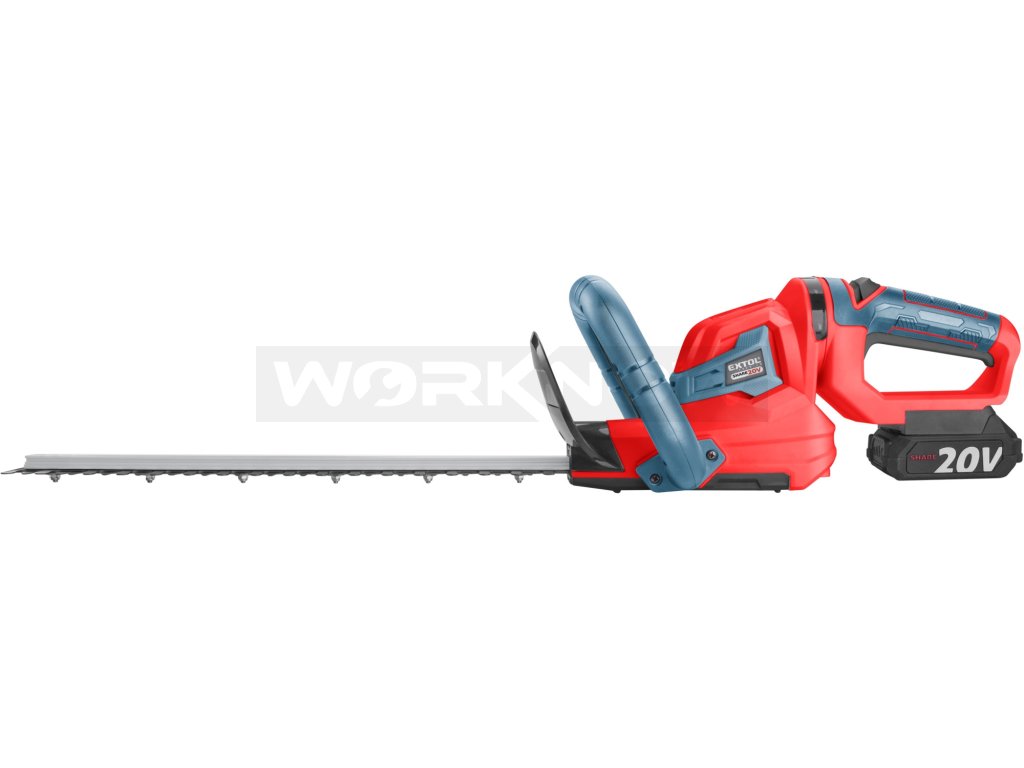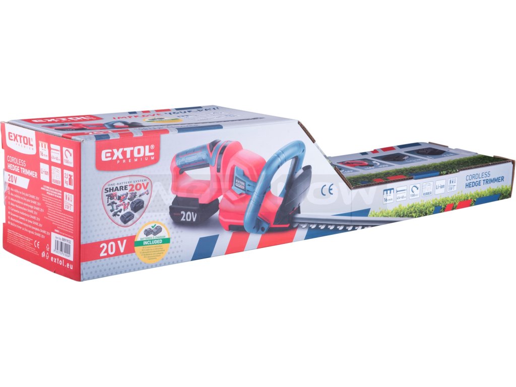 Aku nůžky jsou určeny ke stříhání živého plotu až se středně silnými větvičkami v domácích zahradách. Maximální průměr střihaných větví je 16mm. Ostrá stříhací čepel si snadno poradí s živým plotem a je osazena hliníkovou lištou, která ji chrání před poškozením. Tuto čepel lze otáčet až o 90˚ což usnadňuje stříhání ve vertikální i horizontální poloze. Proti odletujícím kouskům větví je uživatel chráněn pevným plastovým krytem. Stroj je vybaven bezpečnostní pojistkou, která se aktivuje při vyklouznutí z rukou a elektronickou doběhovou brzdou, která zajistí jeho rychlé zastavení. Pogumovaná rukojeť brání vysmeknutí, tlumí vibrace a zpříjemňuje držení při práci. Nůžky jsou navrženy tak, aby byly lehké a ergonomické. Mají dobře vyváženou konstrukci, která snižuje namáhání rukou a zad při delší práci. Díky napájení z baterie již není nutné dávat pozor na napájecí kabel a manipulace s nimi je pohodlnější. Také nikoho nebude rušit hlukem, který vydávají benzínové modely. Aku nůžky nevyžadují složitou péči. Stačí je pravidelně čistit, udržovat ostří čepele a kontrolovat stav baterie. Pro běžnou práci dostačují jeden nebo dva 2Ah akumulátory, které můžete rychle nabít v rychlonabíječce, pro náročnější nebo delší práci doporučujeme větší akumulátory s kapacitou 4–8Ah. Akumulátor má indikátor nabití a lze použít ve všech typech nářadí řady EXTOL SHARE20V. Díky použité Li-ion technologii je ho možné kdykoliv dobíjet, aniž by se tím snižovala jeho kapacita. Li-ion akumulátor ztrácí energii vlivem samovybíjení velmi pomalu a vydrží dlouho nabitý a připravený k použití.- dobré vyvážení aku nůžek