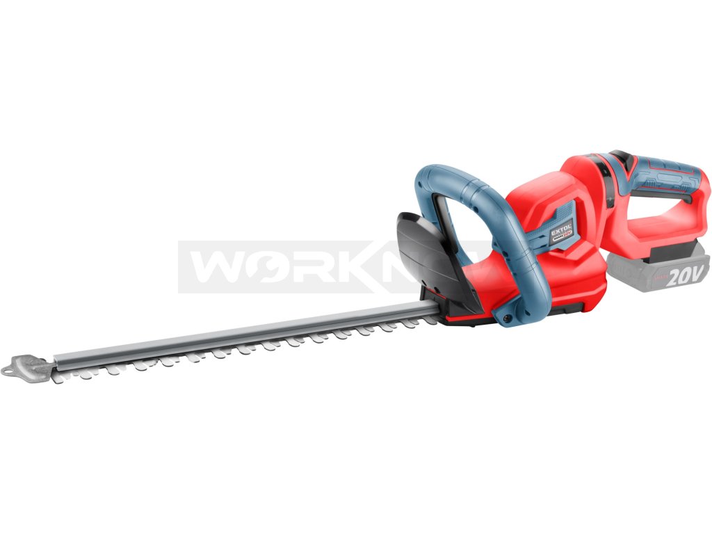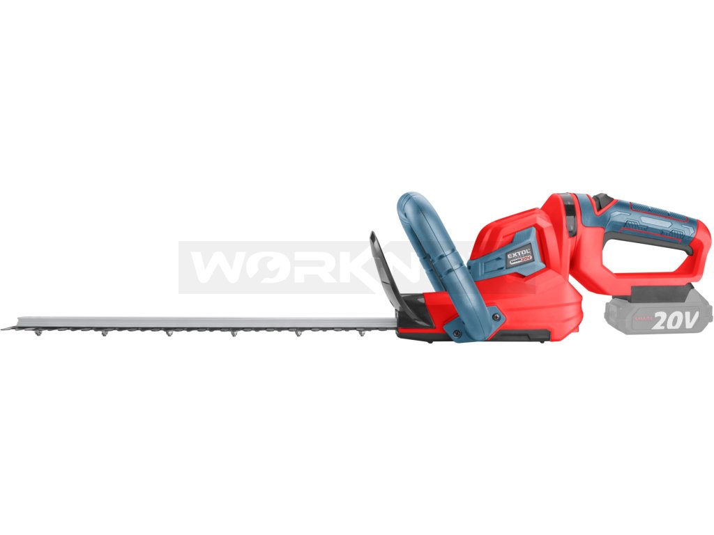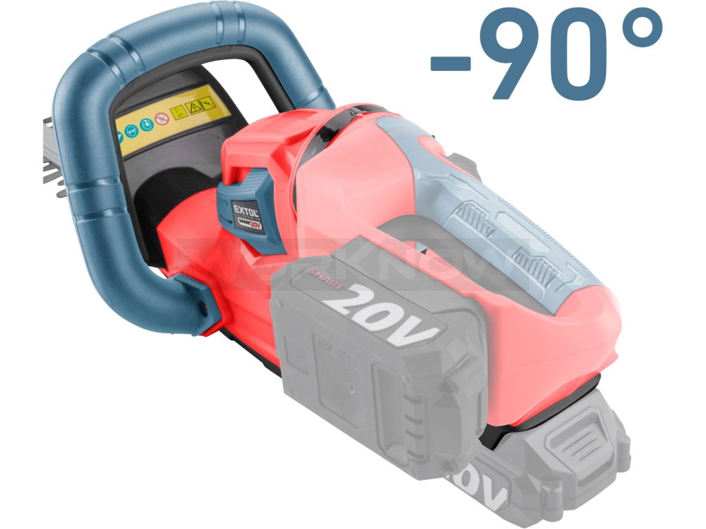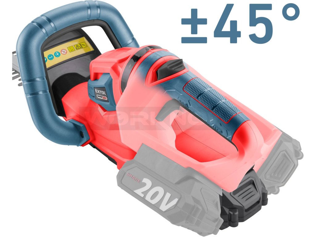 Aku nůžky jsou určeny ke stříhání živého plotu až se středně silnými větvičkami v domácích zahradách. Maximální průměr střihaných větví je 16mm. Ostrá stříhací čepel si snadno poradí s živým plotem a je osazena hliníkovou lištou, která ji chrání před poškozením. Tuto čepel lze otáčet až o 90˚ což usnadňuje stříhání ve vertikální i horizontální poloze. Proti odletujícím kouskům větví je uživatel chráněn pevným plastovým krytem. Stroj je vybaven bezpečnostní pojistkou, která se aktivuje při vyklouznutí z rukou a elektronickou doběhovou brzdou, která zajistí jeho rychlé zastavení. Pogumovaná rukojeť brání vysmeknutí, tlumí vibrace a zpříjemňuje držení při práci. Nůžky jsou navrženy tak, aby byly lehké a ergonomické. Mají dobře vyváženou konstrukci, která snižuje namáhání rukou a zad při delší práci. Díky napájení z baterie již není nutné dávat pozor na napájecí kabel a manipulace s nimi je pohodlnější. Také nikoho nebude rušit hlukem, který vydávají benzínové modely. Aku nůžky nevyžadují složitou péči. Stačí je pravidelně čistit, udržovat ostří čepele a kontrolovat stav baterie. Pro běžnou práci dostačují jeden nebo dva 2Ah akumulátory, které můžete rychle nabít v rychlonabíječce, pro náročnější nebo delší práci doporučujeme větší akumulátory s kapacitou 4–8Ah. Akumulátor má indikátor nabití a lze použít ve všech typech nářadí řady EXTOL SHARE20V. Díky použité Li-ion technologii je ho možné kdykoliv dobíjet, aniž by se tím snižovala jeho kapacita. Li-ion akumulátor ztrácí energii vlivem samovybíjení velmi pomalu a vydrží dlouho nabitý a připravený k použití.- dobré vyvážení aku nůžek