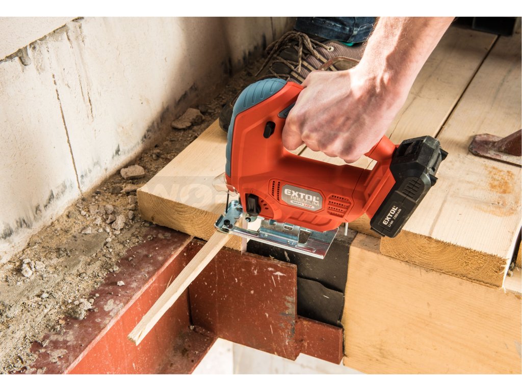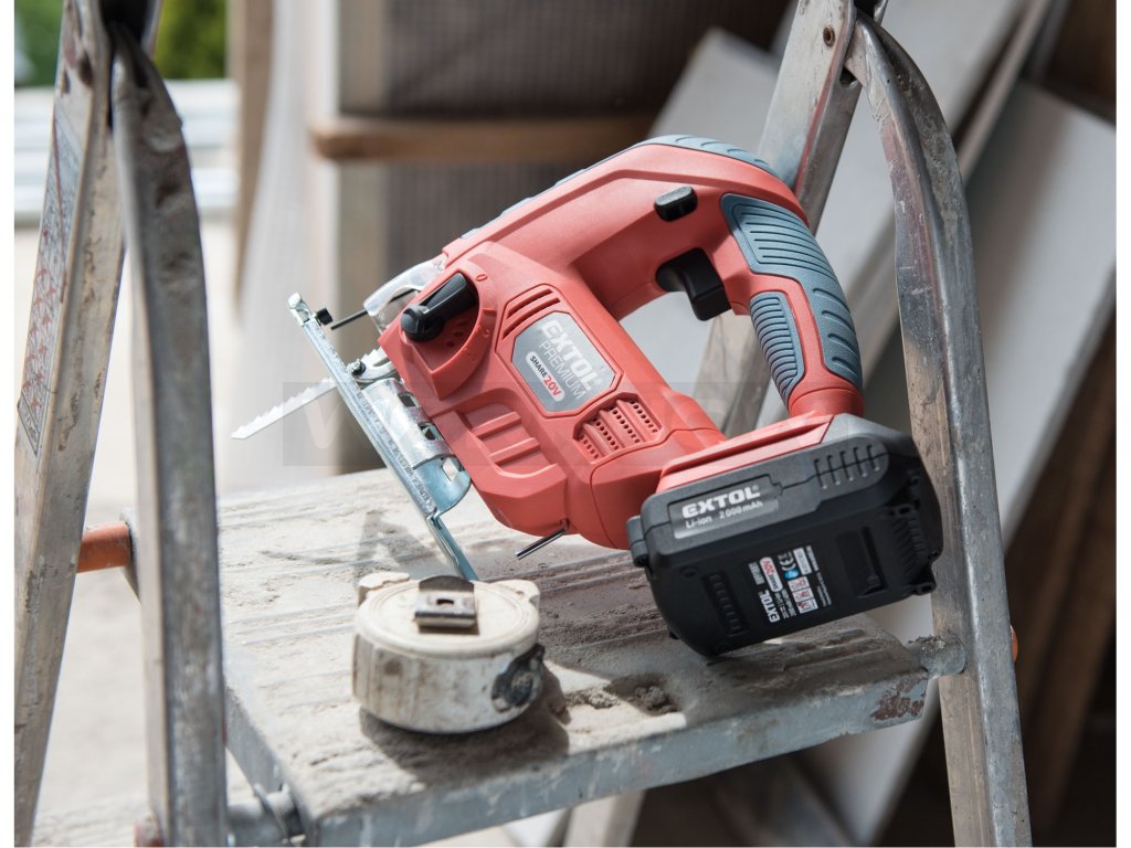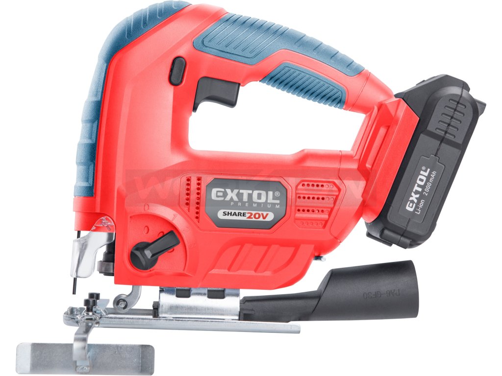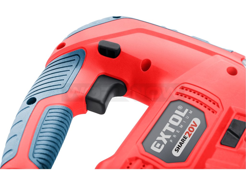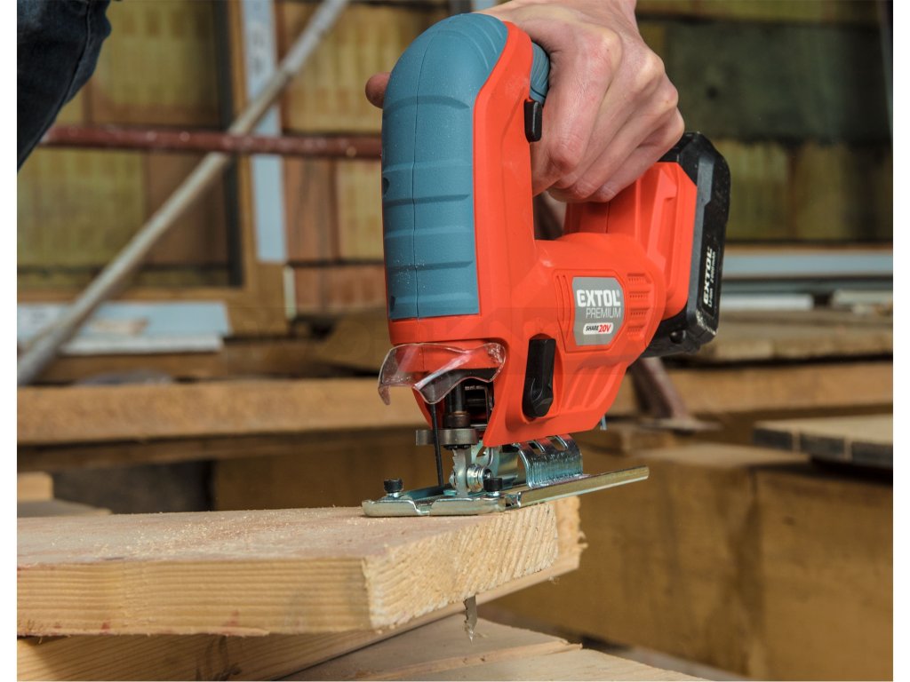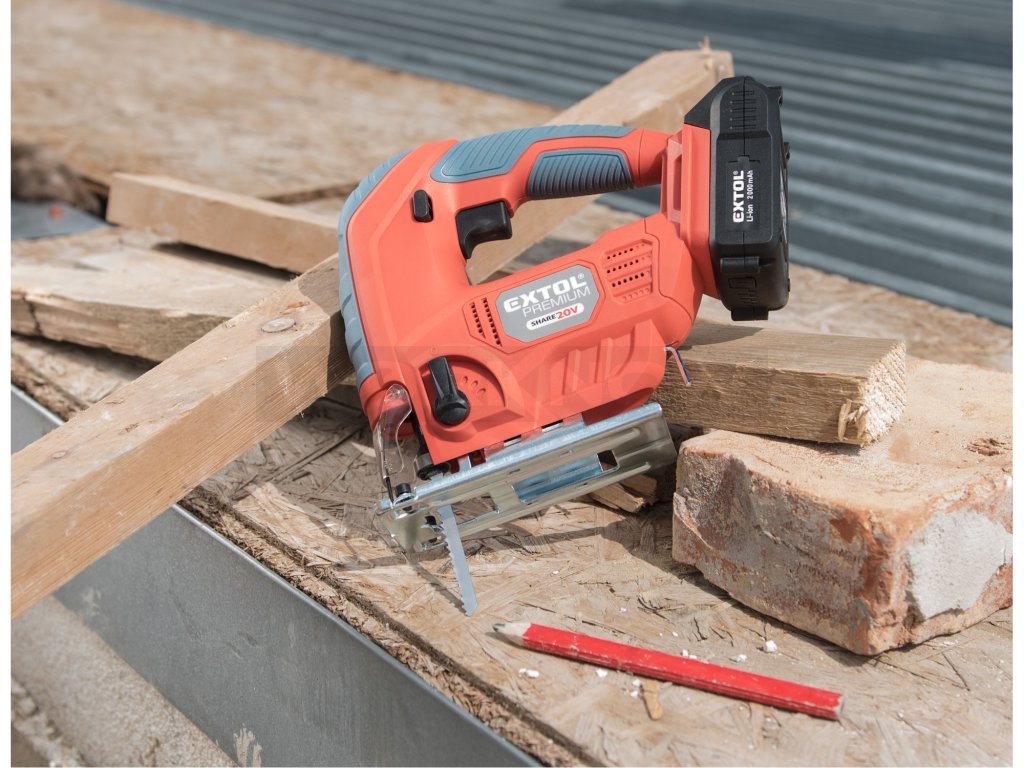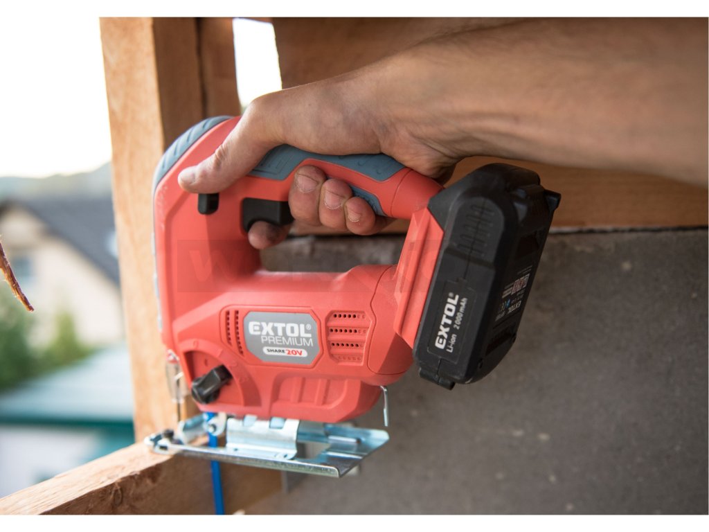 Aku přímočará pila SHARE20V je určena k provádění dělících a tvarových řezů, zejména do dřeva a dřevotřísky a k řezání kovů, plastu, keramických desek a gumy, dále sádrokartonu, cementotřískového materiálu. Díky rychloupínacímu systému lze pilový plátek „Bosch“ vyměnit bez použití nástrojů. Lze použít plátek jakéhokoliv výrobce s tímto úchytem. Standartně při řezání pila odfukuje piliny z místa řezání, ale pokud k ní připojíte vysavač, můžete tento odfuk přepnout a piliny přímo odsávat do vysavače, čímž dosáhnete mnohem čistějšího pracovního místa. Při řezání sádrokartónu a podobných materiálů s velmi jemným prachem je nutno vždy používat odsávání vysavačem. Při práci můžete regulovat rychlost kmitů pomocí spínače a také můžete nastavit sílu předkmitu. Obě nastavení se používají pro změnu stylu a rychlosti řezání v odlišných materiálech. Pro snadnější práci má pila LED světlo osvětlující pracovní místo, které se automaticky zapíná při stisku spínače. Gumová vrstva pokrývající pilu v místě úchopu snižuje množství vibrací, které se přenášejí do rukou a snižuje únavu při práci. Pro běžnou práci dostačují jeden nebo dva 2000mAh akumulátory, které můžete rychle nabít v rychlonabíječce, pro náročnější nebo delší práci doporučujeme větší akumulátory s kapacitou 4000–8000mAh. Akumulátor lze použít ve všech typech nářadí řady EXTOL SHARE20V. Díky použité Li-ion technologii je ho možné kdykoliv dobíjet, aniž by se tím snižovala jeho kapacita. Li-ion akumulátor ztrácí energii vlivem samovybíjení velmi pomalu a vydrží dlouho nabitý a připravený k použití.- rychloupínací systém plátků
