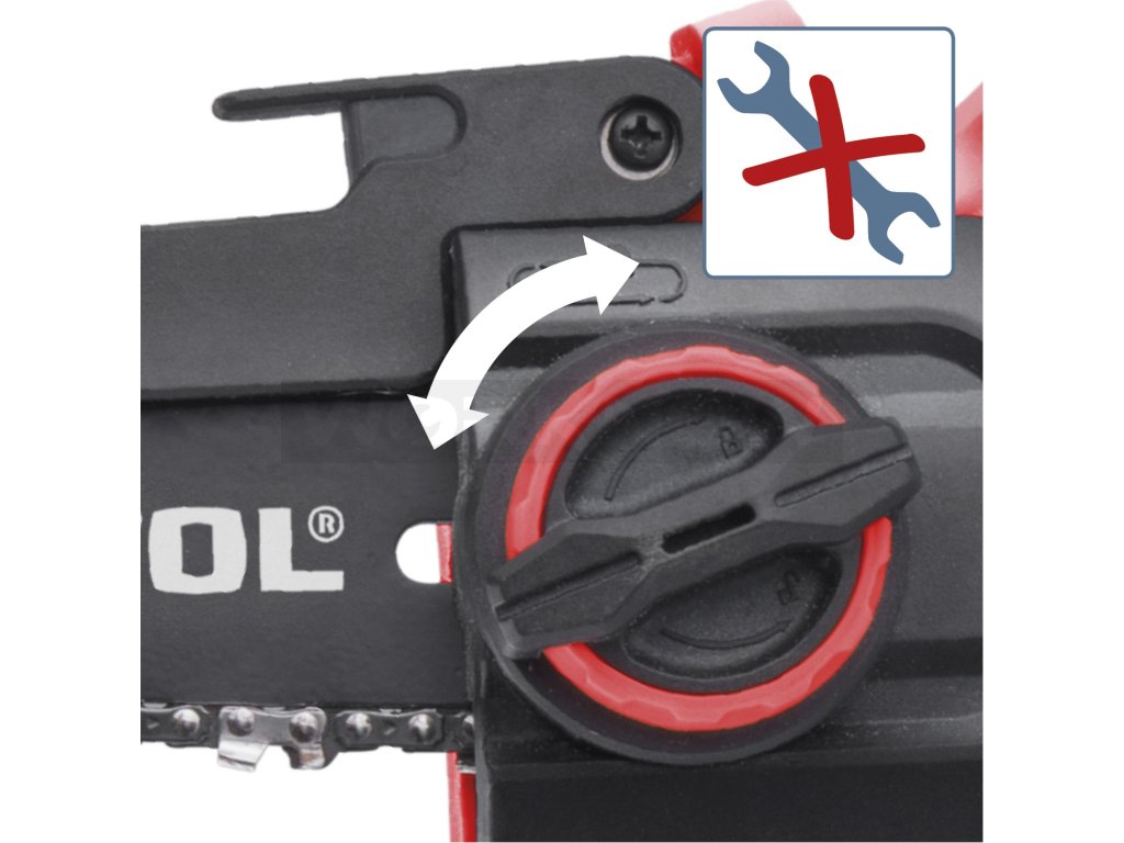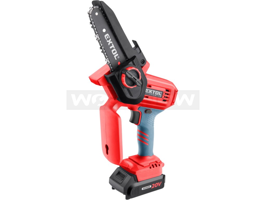 Jednoruční řetězová aku pila je určena k prořezávání stromů a keřů a pro drobné zkracovací řezy dřeva na zahradě, v dílně apod. Aku řetězová pila spojuje výhody elektrických pil – nízký hluk, jednoduchost obsluhy a údržby se svobodou pohybu u benzínových pil. Tato malá aku pila váží jen 1,8kg a je dostatečně robustní na to, aby si snadno poradila s větvemi, ale zároveň dostatečně lehká na to, aby se dala ovládat jednou rukou. Je vybavena kvalitní vodící lištou a pilovým řetězem. Pila má také systém pro snadnou a rychlou výměnu řetězu a mechanismem pro jednoduché vypnutí řetězu. Vysokou bezpečnost zajišťují tři prvky: horní chránič řetězu, chránič rukou, který vás chrání před pořezáním, poškrábáním a škrábanci a spínačem s pojistkou zabraňující náhodnému spuštění. Pogumovaná rukojeť brání vysmeknutí, tlumí vibrace a zpříjemňuje držení při práci. Akumulátor je vybaven ukazatelem nabití, což umožňuje uživateli si rozvrhnout délku práce a dát si včas nabít další akumulátor. Pro běžnou práci dostačují jeden nebo dva 2Ah akumulátory, které můžete rychle nabít v rychlonabíječce, pro náročnější nebo delší práci doporučujeme větší akumulátory s kapacitou 4–8Ah. Akumulátor lze použít ve všech typech nářadí řady EXTOL SHARE20V. Díky použité Li-ion technologii je ho možné kdykoliv dobíjet, aniž by se tím snižovala jeho kapacita. Li-ion akumulátor ztrácí energii vlivem samovybíjení velmi pomalu a vydrží dlouho nabitý a připravený k použití.- práce jednou rukou