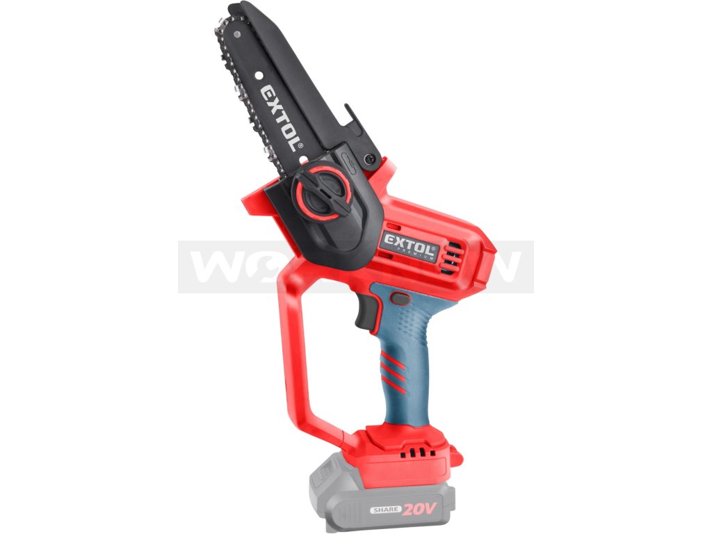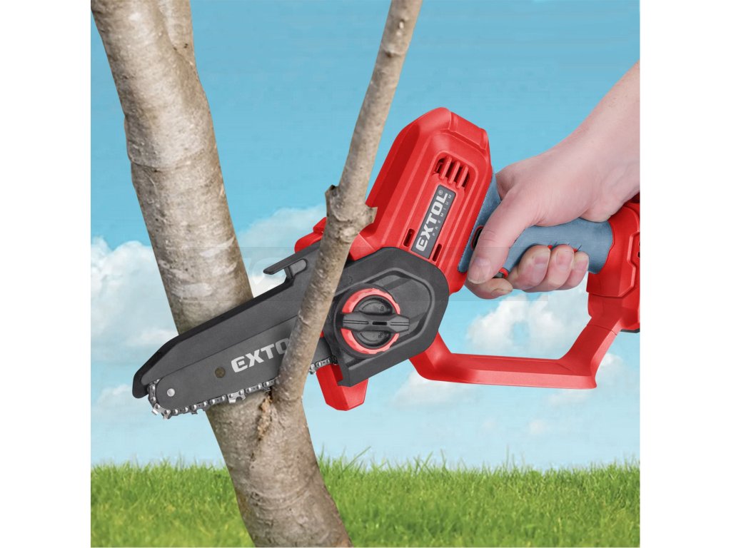 Jednoruční řetězová aku pila je určena k prořezávání stromů a keřů a pro drobné zkracovací řezy dřeva na zahradě, v dílně apod. Aku řetězová pila spojuje výhody elektrických pil – nízký hluk, jednoduchost obsluhy a údržby se svobodou pohybu u benzínových pil. Tato malá aku pila váží jen 1,8kg a je dostatečně robustní na to, aby si snadno poradila s větvemi, ale zároveň dostatečně lehká na to, aby se dala ovládat jednou rukou. Je vybavena kvalitní vodící lištou a pilovým řetězem. Pila má také systém pro snadnou a rychlou výměnu řetězu a mechanismem pro jednoduché vypnutí řetězu. Vysokou bezpečnost zajišťují tři prvky: horní chránič řetězu, chránič rukou, který vás chrání před pořezáním, poškrábáním a škrábanci a spínačem s pojistkou zabraňující náhodnému spuštění. Pogumovaná rukojeť brání vysmeknutí, tlumí vibrace a zpříjemňuje držení při práci. Akumulátor je vybaven ukazatelem nabití, což umožňuje uživateli si rozvrhnout délku práce a dát si včas nabít další akumulátor. Pro běžnou práci dostačují jeden nebo dva 2Ah akumulátory, které můžete rychle nabít v rychlonabíječce, pro náročnější nebo delší práci doporučujeme větší akumulátory s kapacitou 4–8Ah. Akumulátor lze použít ve všech typech nářadí řady EXTOL SHARE20V. Díky použité Li-ion technologii je ho možné kdykoliv dobíjet, aniž by se tím snižovala jeho kapacita. Li-ion akumulátor ztrácí energii vlivem samovybíjení velmi pomalu a vydrží dlouho nabitý a připravený k použití.- práce jednou rukou