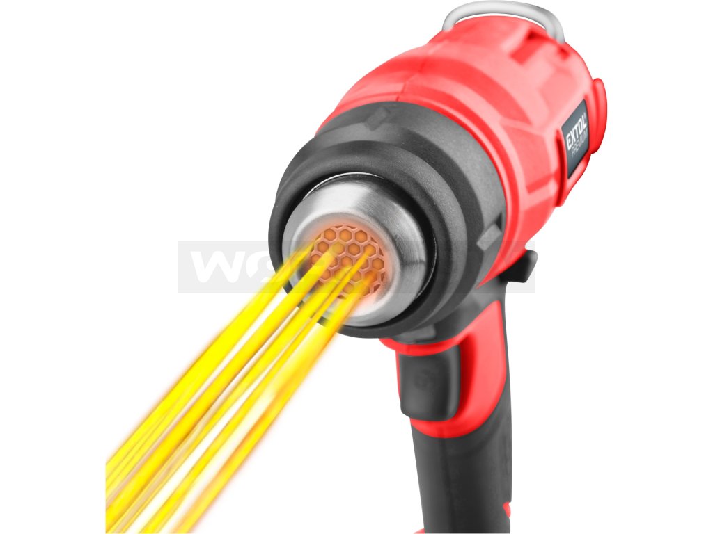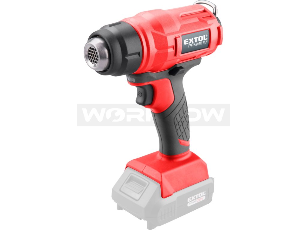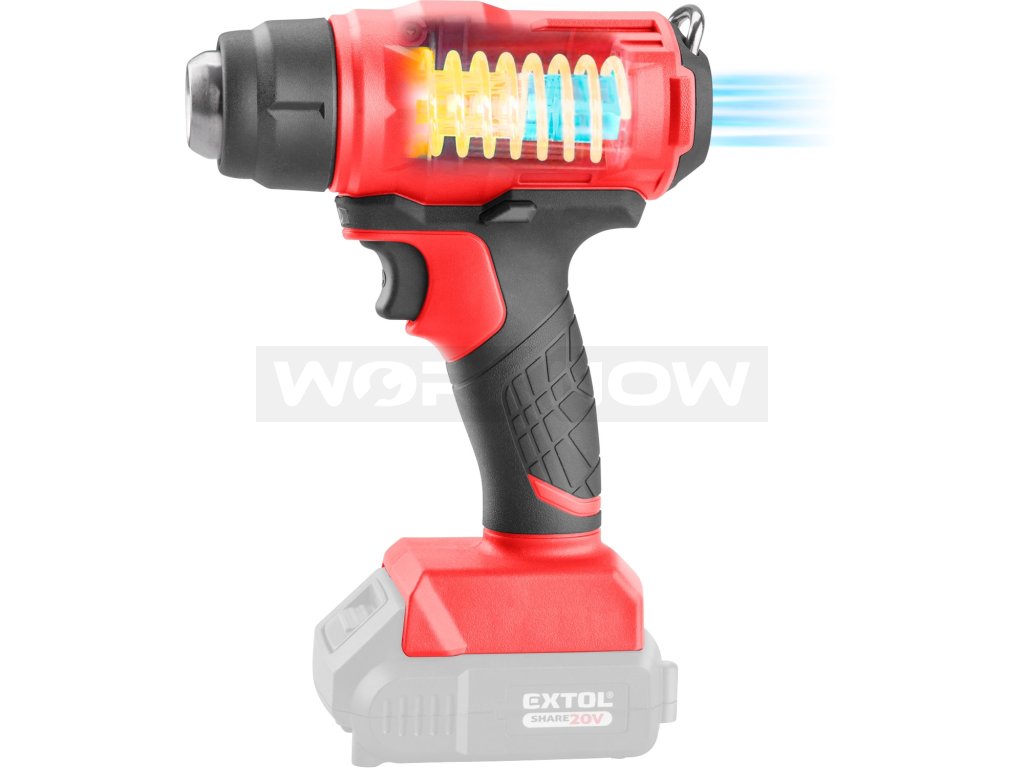 Aku horkovzdušná pistole s teplotou vzduchu až 550°C je určena k tvarování, smršťování a spojování umělých hmot, k ohýbání plastových trubek, k uvolňování lepených spojů, dále k rozmrazování zamrzlého potrubí, k odstranění mechu a plevelů ve spárách dlažby, k zapalování grilovacího uhlí, sušení atd. V malém rozsahu lze použít také na odstraňování starých barev a laků. Pistole se nahřeje na provozní teplotu za 5 vteřin od zapnutí díky elektronickému řízení nahřívání. Pro zvýšení životnosti stroje, ventilátor pracuje ještě několik vteřin po uvolnění spínače, aby ochladil topnou spirálu. Pistole je vybaven LED svítilnou, která osvětluje pracovní prostor při práci a háčkem na zavěšení. Součástí dodávky jsou tři vyměnitelné trysky – redukční tryska (úzký proud vzduchu): pro koncentrování proudu vzduchu (tepla) do malého místa, např. pro pájení či ohýbání plexiskla, široká tryska: pro nahřívání širší plochy, trubková tryska: pro nahřívání trubek. Díky integrovanému snímacímu prstenci lze z pistole rychle sejmout horkou koncovku a vyměnit ji za jinou bez vyčkávání na zchladnutí nebo bez použití kleští. Pro běžnou práci dostačují jeden nebo dva 2000mAh akumulátory, které můžete rychle nabít v rychlonabíječce, pro náročnější nebo delší práci doporučujeme větší akumulátory s kapacitou 4000–8000mAh. Akumulátor lze použít ve všech typech nářadí řady EXTOL SHARE20V. Díky použité Li-ion technologii je ho možné kdykoliv dobíjet, aniž by se tím snižovala jeho kapacita. Li-ion akumulátor ztrácí energii vlivem samovybíjení velmi pomalu a vydrží dlouho nabitý a připravený k použití.- po vypnutí chladí spirálu