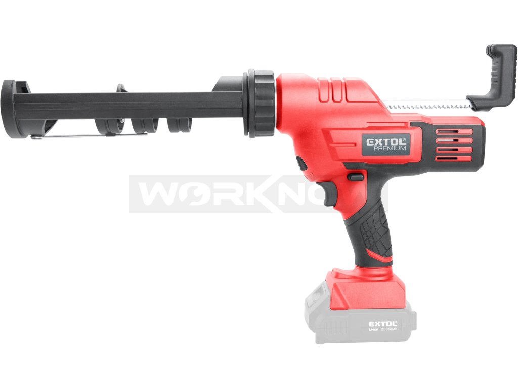 Aku vytlačovací vaničková pistole je určena k vytlačování silikonu, chemických kotev apod. z kartuší. Rychlost posuvu lze nastavit na 6polohovém regulátoru v rozsahu 50-560mm/min, což umožňuje přesnou regulaci toku hmoty. Silný motor a převody vyvinou tlak až 2000N tlačné síly. Pistole má funkci ANTI-DRIP, která po zastavení pistole automaticky popojede nazpátek a díky tomuto uvolnění tlaku v tubě, nepokračuje vytlačování hmoty. Pro zrychlení práce není zpětný chod motorizovaný, ale jen rychle povytáhnete píst. Vaničku je možno otočit v rozsahu 360°. Stroj je vybaven ochrannou proti přetížení. Rukojeť je pokryta měkkou protiskluzovou gumou, která snižuji vibrace a dobře se drží. Přímo nad baterií je umístěno osvětlení, které osvětluje pracovní místo. Pro běžnou práci dostačují jeden nebo dva 2000mAh akumulátory, které můžete rychle nabít v rychlonabíječce, pro náročnější nebo delší práci doporučujeme větší akumulátory s kapacitou 4000–8000mAh. Akumulátor lze použít ve všech typech nářadí řady EXTOL SHARE20V. Díky použité Li-ion technologii je ho možné kdykoliv dobíjet, aniž by se tím snižovala jeho kapacita. Li-ion akumulátor ztrácí energii vlivem samovybíjení velmi pomalu a vydrží dlouho nabitý a připravený k použití.- tlačná síla 2000N