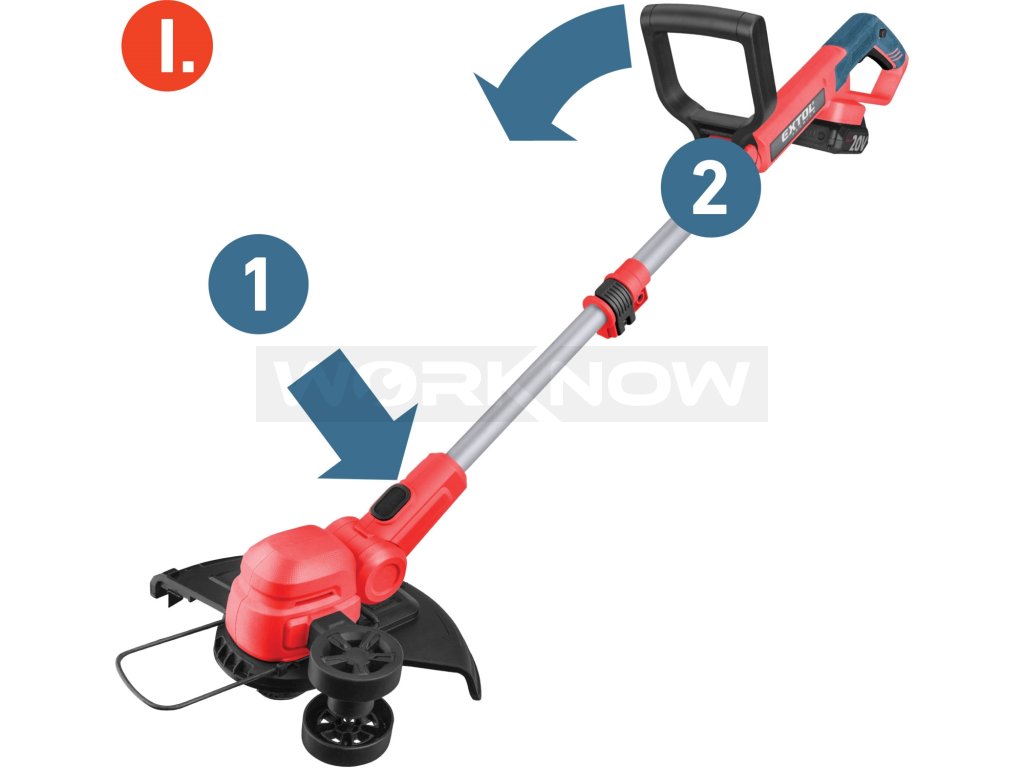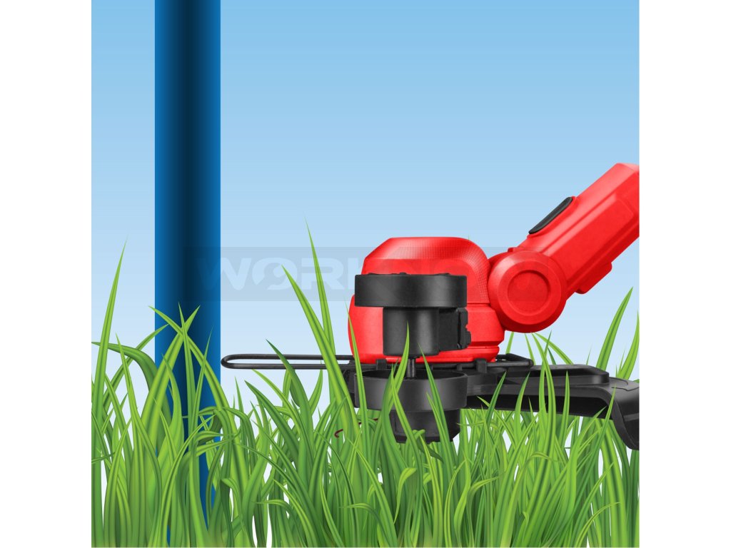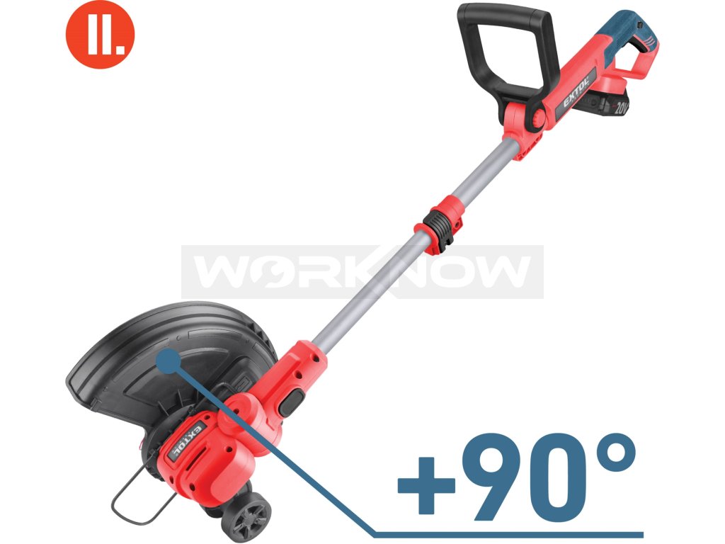 Strunová sekačka je ideální pro údržbu zahradního trávníku, úpravu jeho okrajů a sekání trávy na těžko přístupných místech, jako jsou obrubníky, prostory pod lavičkami, kolem stromů a keřů, kde není možné použít pojízdnou sekačku. Sekací hlava umožňuje nastavení úhlu a otočení o 90°, což usnadňuje práci podél chodníků, příjezdových cest a dalších hran. Rukojeť lze prodloužit až o 26 cm, a proto sekačku pohodlně ovládají lidé všech výšek. Strunu lze prodloužit manuálně stiskem tlačítka na hlavě nebo poloautomaticky během sekání. Ochranný kryt je vybaven nožem, který automaticky zastřihává strunu na správnou délku. Díky bateriovému napájení odpadá starost o napájecí kabel, sekačka je lehčí, snadno ovladatelná a velmi tichá, což oceníte zejména při sekání v hustě obydlených oblastech nebo brzy ráno. Pogumovaná rukojeť zajišťuje bezpečný a pohodlný úchop, tlumí vibrace a zabraňuje vyklouznutí. Vytahovací distanční oblouk usnadňuje sekání podél plotů, zdí a stromů a zároveň šetří strunu. Údržba sekačky je minimální – díky moderní konstrukci není potřeba pravidelně mazat ani se starat o složité servisní úkony. Pro běžné použití postačí jeden nebo dva 2Ah akumulátory, které lze rychle dobít v rychlonabíječce. Pro náročnější nebo delší práci doporučujeme akumulátory s vyšší kapacitou 4–8Ah. Akumulátor je vybaven indikátorem nabití a je kompatibilní se všemi nástroji řady EXTOL SHARE20V. Díky Li-ion technologii jej můžete dobíjet kdykoli bez obav o snížení kapacity. Li-ion akumulátory se samovybíjením ztrácejí energii velmi pomalu, zůstávají dlouho nabité a vždy připravené k použití.- záběr 30cm