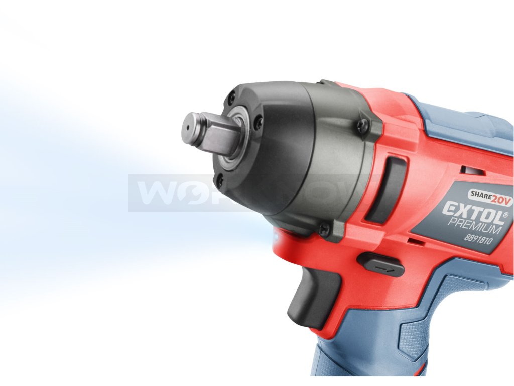 Lehký a výkonný rázový aku utahovák s max. kroutícím momentem 180Nm Vám poskytuje výkon, který potřebujete k dokončení široké škály utahovacích operací – utahování a povolování šroubů. Rázový moment zvyšuje sílu utahováku při šroubování a zároveň snižuje spotřebu baterie. Proto je při šroubování mnohem efektivnější než aku vrtačka a také zašroubuje více šroubů na jedno nabití baterie. Celokovová převodovka zajišťuje bezchybný chod při i vysoké zátěži a přispívá k lepšímu odvodu tepla vznikajícího při práci. Pro běžnou práci dostačují jeden nebo dva 2000mAh akumulátory, které můžete rychle nabít v rychlonabíječce, pro náročnější nebo delší práci doporučujeme větší akumulátory s kapacitou 4000–8000mAh. Akumulátor lze použít ve všech typech nářadí řady EXTOL SHARE20V. Díky použité Li-ion technologii je ho možné kdykoliv dobíjet, aniž by se tím snižovala jeho kapacita. Li-ion akumulátor ztrácí energii vlivem samovybíjení velmi pomalu a vydrží dlouho nabitý a připravený k použití.- hlava se čtyřhranem 1/2"
