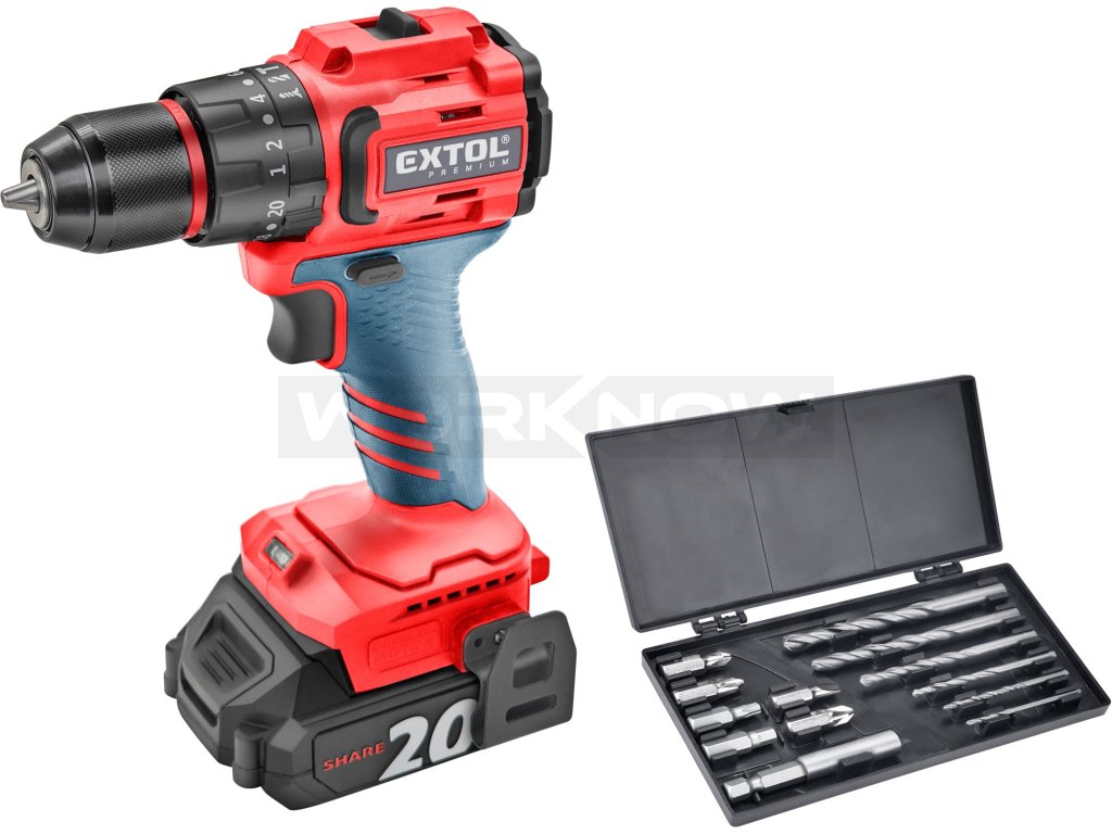 Lehký a výkonný dvourychlostní vrtací aku šroubovák s příklepem Vám poskytuje vysoký vrtací výkon při vrtání do široké škály materiálů – ocel, kovy, dřevo, plast, ale s příklepem také do zdiva. Je určen pro náročné práce a díky svému příjemnému designu se s ním velmi dobře pracuje i při dlouhodobém používání. Vrtačka je poháněná nejmodernějším „brushless" motorem. Tento nový typ motoru má vyšší životnost, je výkonnější a má menší spotřebu el. energie než klasické motory s uhlíkovými kartáči. Celokovová převodovka s 5ozubenými kolečky je speciálně navržena pro vysoký kroutící moment a zajišťuje bezchybný chod i při vysoké zátěži. Vrtáky se upínají do kvalitního celokovového sklíčidla s aretací. Díky plynulému nastavení momentů, lze využít celý rozsah stupnice a nejen vyznačených 20 stupňů. Vrtačka má 3 režimy práce: vrtání, šroubování a vrtání s příklepem. Mechanický příklep je vynikající pro vrtání do tvrdších materiálů. Integrovaná LED svítilna umístněná na spodní části rukojeti osvětluje pracovní prostor a pro zlepšení orientace v tmavých prostorech má zpožděné vypnutí. Pro běžnou práci dostačují jeden nebo dva 2Ah akumulátory, které můžete rychle nabít v rychlonabíječce, pro náročnější nebo delší práci doporučujeme větší akumulátory s kapacitou 4–8Ah. Akumulátor lze použít ve všech typech nářadí řady EXTOL SHARE20V. Díky použité Li-ion technologii je ho možné kdykoliv dobíjet, aniž by se tím snižovala jeho kapacita. Li-ion akumulátor ztrácí energii vlivem samovybíjení velmi pomalu a vydrží dlouho nabitý a připravený k použití.- 50Nm brushless motor