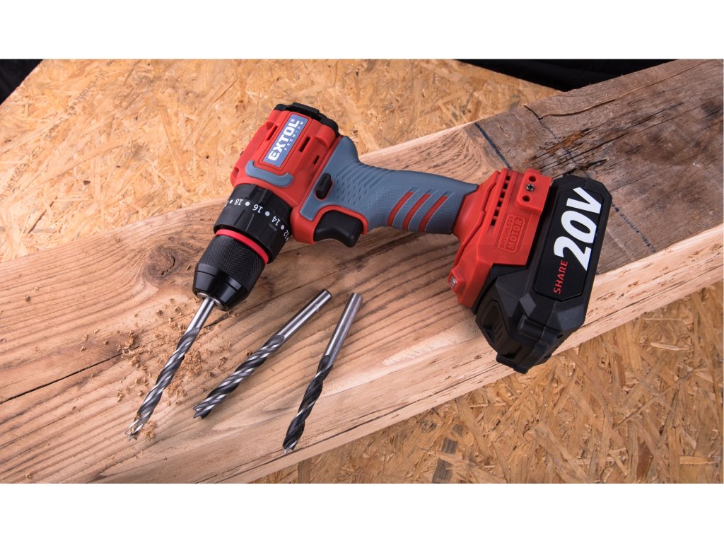 Lehký a výkonný dvourychlostní vrtací aku šroubovák s příklepem Vám poskytuje vysoký vrtací výkon při vrtání do široké škály materiálů – ocel, kovy, dřevo, plast, ale s příklepem také do zdiva. Je určen pro náročné práce a díky svému příjemnému designu se s ním velmi dobře pracuje i při dlouhodobém používání. Vrtačka je poháněná nejmodernějším „brushless" motorem. Tento nový typ motoru má vyšší životnost, je výkonnější a má menší spotřebu el. energie než klasické motory s uhlíkovými kartáči. Celokovová převodovka s 5ozubenými kolečky je speciálně navržena pro vysoký kroutící moment a zajišťuje bezchybný chod i při vysoké zátěži. Vrtáky se upínají do kvalitního celokovového sklíčidla s aretací. Díky plynulému nastavení momentů, lze využít celý rozsah stupnice a nejen vyznačených 20 stupňů. Vrtačka má 3 režimy práce: vrtání, šroubování a vrtání s příklepem. Mechanický příklep je vynikající pro vrtání do tvrdších materiálů. Integrovaná LED svítilna umístněná na spodní části rukojeti osvětluje pracovní prostor a pro zlepšení orientace v tmavých prostorech má zpožděné vypnutí. Pro běžnou práci dostačují jeden nebo dva 2Ah akumulátory, které můžete rychle nabít v rychlonabíječce, pro náročnější nebo delší práci doporučujeme větší akumulátory s kapacitou 4–8Ah. Akumulátor lze použít ve všech typech nářadí řady EXTOL SHARE20V. Díky použité Li-ion technologii je ho možné kdykoliv dobíjet, aniž by se tím snižovala jeho kapacita. Li-ion akumulátor ztrácí energii vlivem samovybíjení velmi pomalu a vydrží dlouho nabitý a připravený k použití.- 50Nm brushless motor