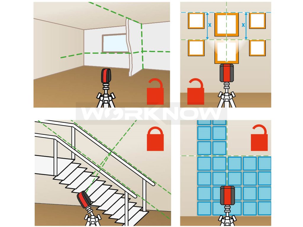 - samonivelační funkce: díky vysoce kvalitní mechanice se paprsek laseru během krátké chvíle samočinně seřídí do přesné polohy