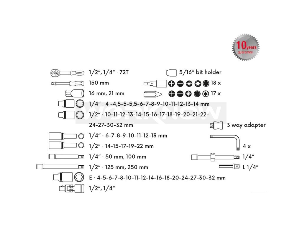 Kvalitní gola sada je vhodná díky kvalitě použitých materiálů a zpracování v profesionální autodílně nebo servisu. 10 let záruka. Všechny části jsou vyrobeny z vysoce kvalitní chrom-vanadiové oceli. Niklová povrchová úprava. Hroty bitů jsou ze slitiny oceli S2. Ráčny mají jemné dělení 72 zubů, tělo ráčny z CrV oceli, zubový mechanismus z S2 oceli, ergonomicky tvarovanou rukojeť se zdravotně nezávadnou gumou. Nový design plastového kufru z primárního materiálu s kovovými uzávěry a panty víka.