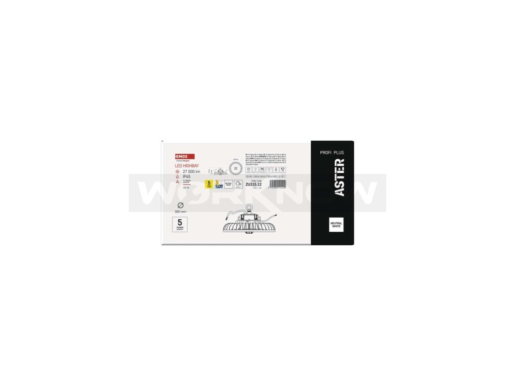 Zajistěte si optimální osvětlení pro vaše prostory s highbay svítidlem ASTER. Prémiové LED čipy Osram dodávají svítidlu velmi vysokou světelnou účinnost 180 lm/W a dlouhou životnost. Vynikající výkon a kvalita světla (CRI > 80) vám pomohou ozářit velké prostory jako sklady, výrobní či sportovní haly apod.