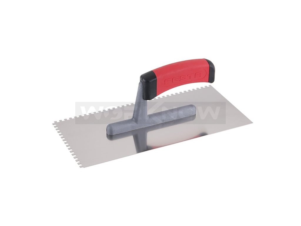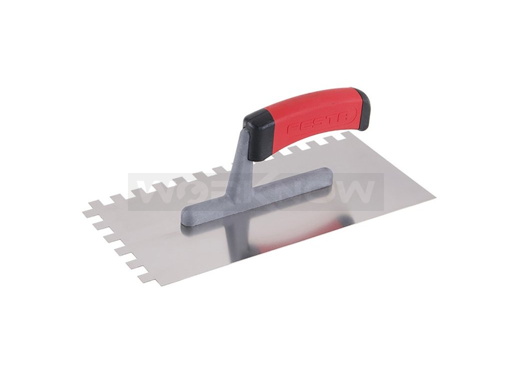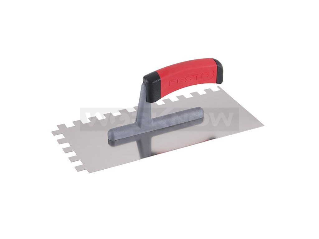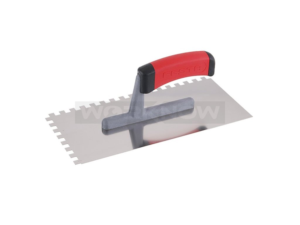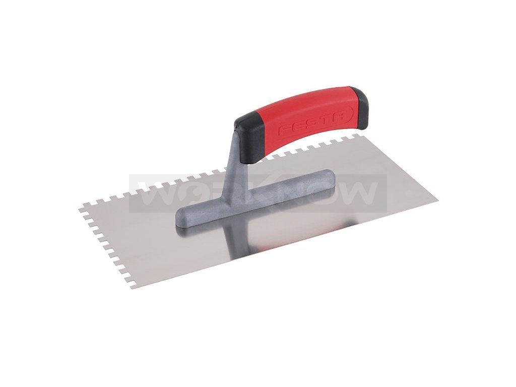 Hladítko nerezové zubové FESTA 280x130 mm, s gumovou ručkou, tl.plechu 0,8mm. Používá se zejména k nanášení lepidel pod obklady a dlažby, dále pak k nanášení stěrek, štuků, omítek, tmelů a dalších stavebních hmot. Hladítko nerezové zubové umožní natáhnout lepidlo či stavební hmotu v pruzích a výšce dle zubu hladítka.