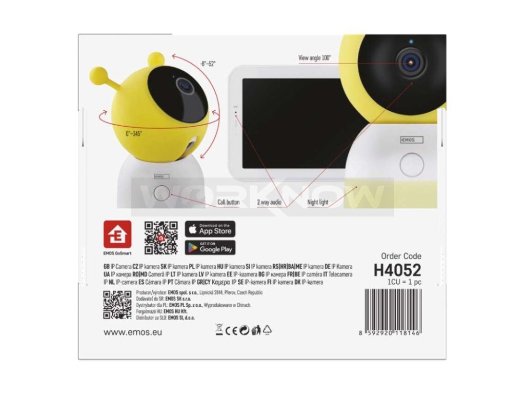 Kameru chůvičky můžete postavit na stůl, poličku, komodu apod., ale lze ji instalovat i na strop. V aplikaci EMOS GoSmart na mobilním telefonu a na LCD monitoru pak jednoduše změníte orientaci obrazu. Prvotní spárování chůvičky s LCD monitorem i mobilním zařízením je snadné a intuitivní.