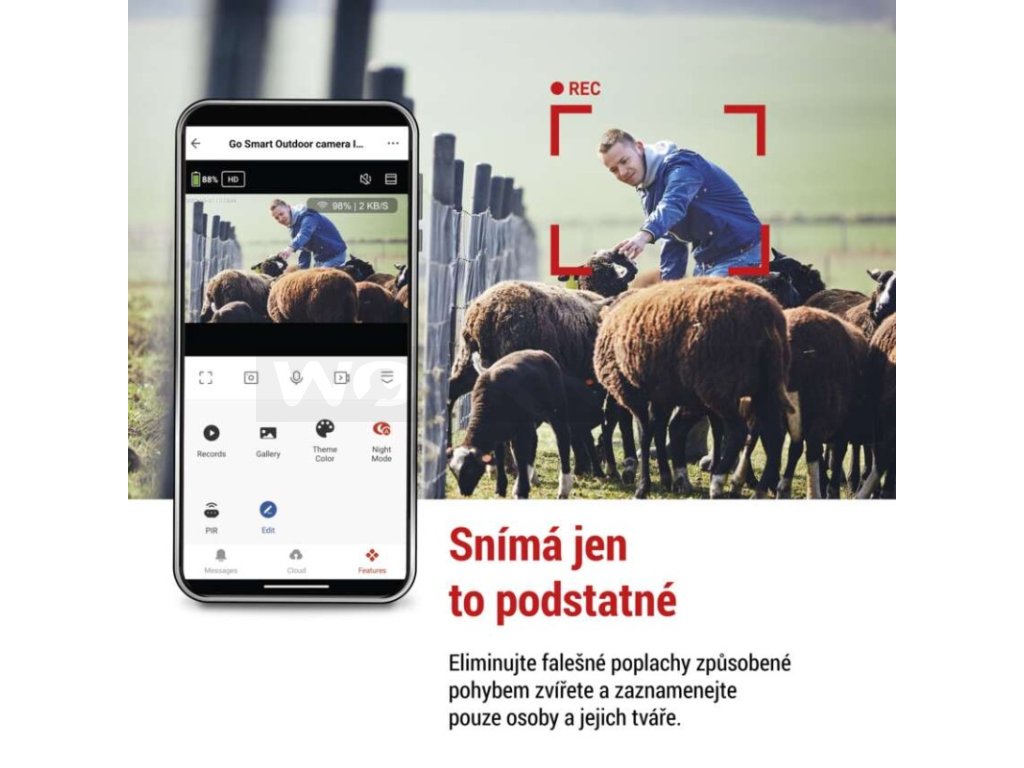 Inteligentní funkce kamery dokáže eliminovat falešné poplachy způsobené pohybem zvířat či dopravních prostředků. Jsou tak zaznamenávány pouze osoby a jejich tváře. Na základě detekce pohybu a zvuku obdržíte notifikaci na váš mobilní telefon a současně začne kamera pořizovat obrazový záznam, který automaticky ukládá na cloudové úložiště nebo mikro SD kartu o kapacitě až 128 GB.
