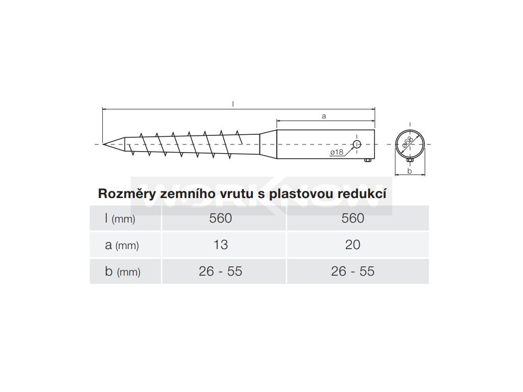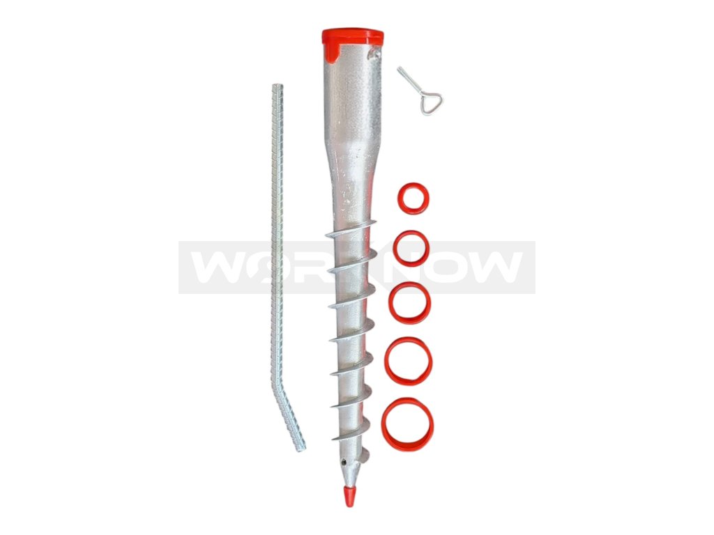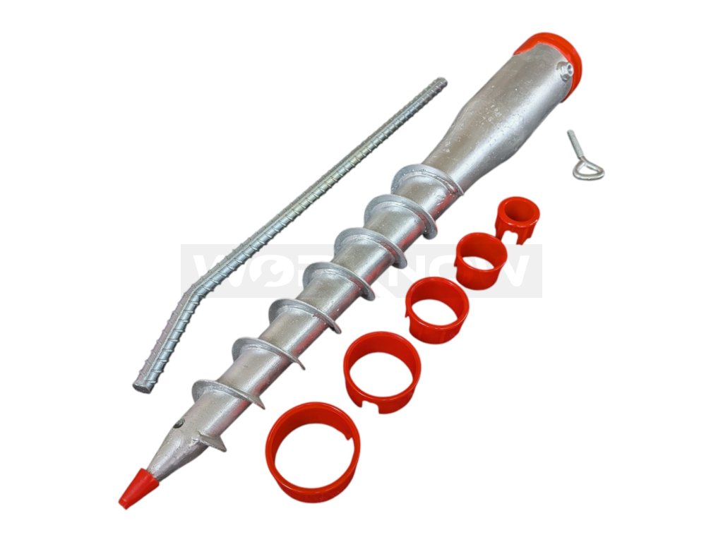 Ocelový zemní vrut s povrchovou úpravou v žárovém zinku s kruhovým otvorem 68 mm. Součástí vrutu je navařená matice M8 pro ukotvení prvku o tloušťce 25 – 65 mm. Součástí balení sada 5 kusů plastových redukcí rozměru 26-55 mm, pojistný šroub a montážní tyč.