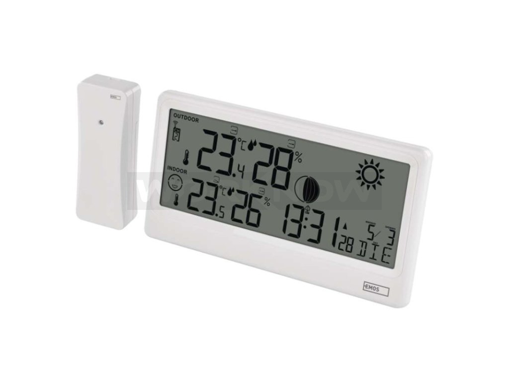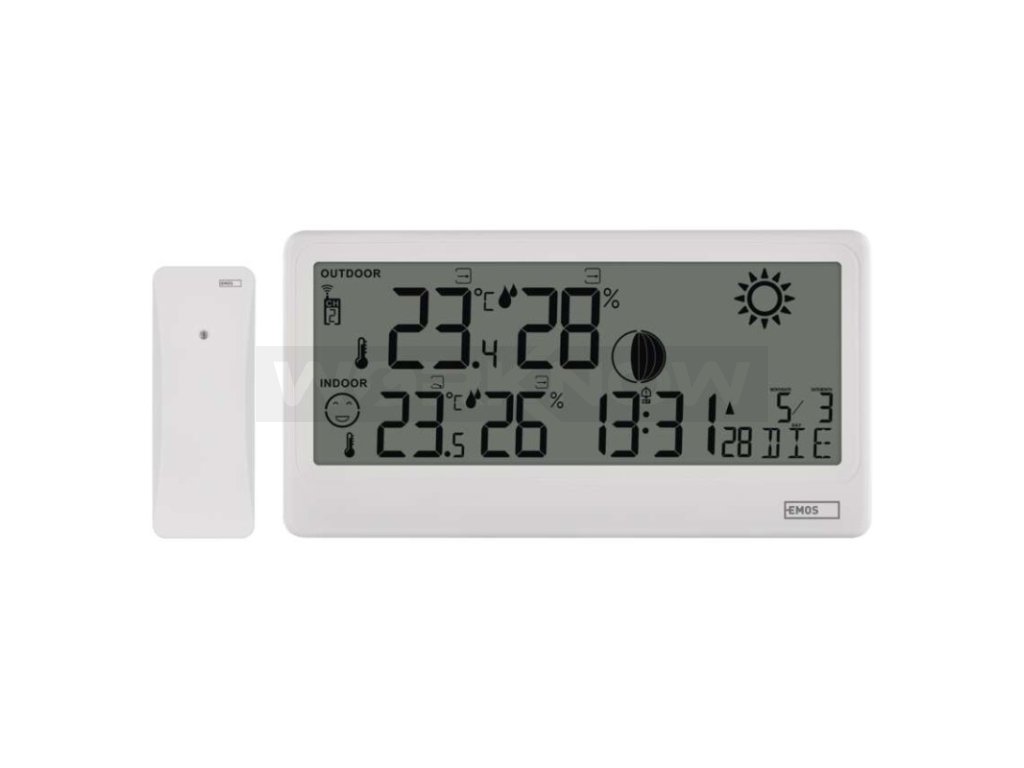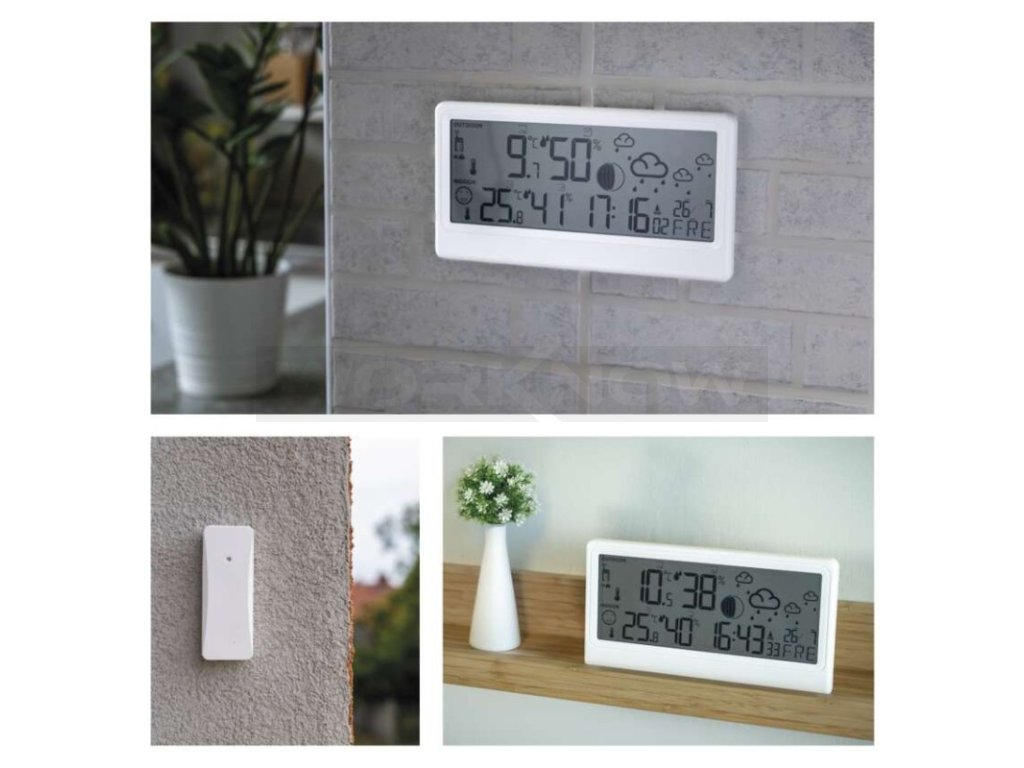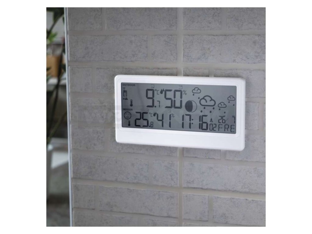 Měří vnitřní a venkovní teplotu a vlhkost.Možnost pověsit na zeď i postavit na stůl.indikace slabých baterií.