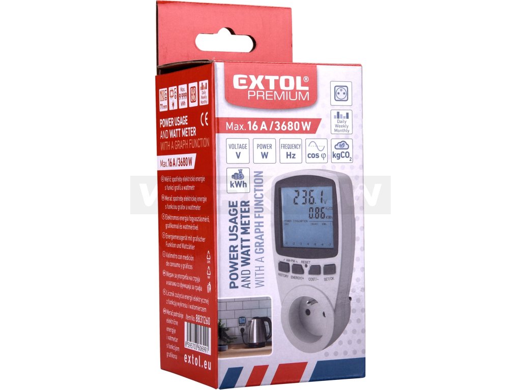 Měřič spotřeby energie je multifunkční měřící přístroj, který slouží k měření příkonu, proudu, napětí, frekvence, účiníku a spotřeby el. energie. Přístroj ukáže aktuální a maximální příkon a proud. Velký displej zobrazuje graf denní/týdenní/měsíční historie spotřeby elektrické energie připojeného elektrospotřebiče a zobrazuje jeho příkon. Po zadání ceny el. energie také spočítá náklady na jeho provoz, případně uhlíkovou stopu. Spotřebiče s velmi proměnlivým chodem (např. lednička) je vhodné nechat zapojené v měřiči delší dobu, aby možno určit průměrnou spotřebu. Pokud plánujete zakoupení záložního zdroje jako je třeba elektrocentrála, nabíjecí stanice apod., můžete použít měřič k určení max. příkonu nutného pro všechny vaše spotřebiče. Čtení hodnot z displeje je usnadněno díky velkým číslům a podsvícení displeje, které se zapne při stisku tlačítka. Díky nabíjecí baterii, lze číst naměřené hodnoty i po vyjmutí přístroje ze zásuvky.- měří příkon, proud, napětí, frekvence a účiník