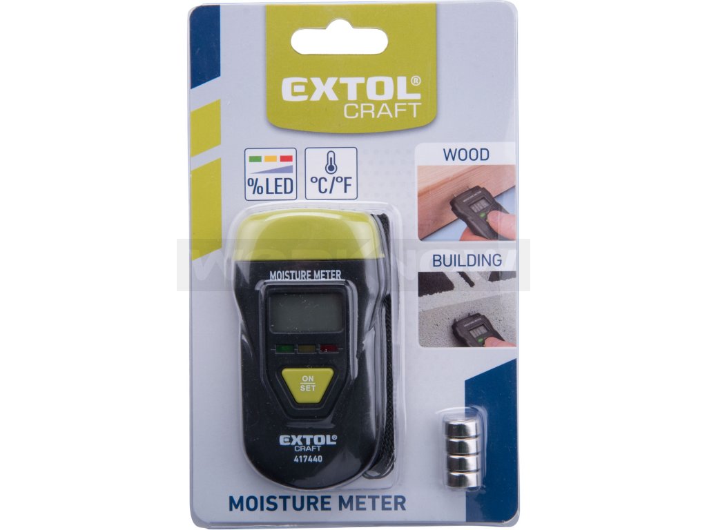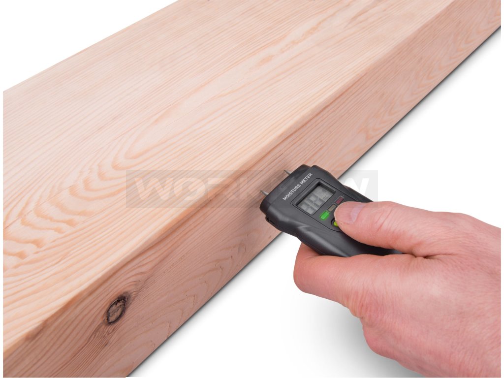 Vlhkoměr je vhodný pro měření vlhkosti v řezaném dřevě (také v papíru, kartonu) a vytvrzených materiálech (malta, beton a sádra). Zobrazuje také vlhkost nebo teplotu ovzduší. Má tři LEDky, které indikují vlhkost měřeného materiálu.- záznam právě naměřené hodnoty