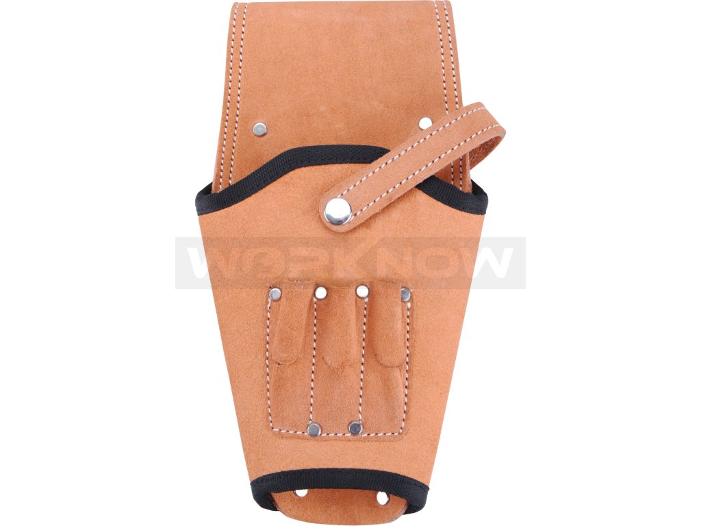 Pouzdro na aku vrtačku kožené, na opasek, s pojistným řemínkem a třemi úchyty pro hroty/šroubovákyDoplňkové parametry