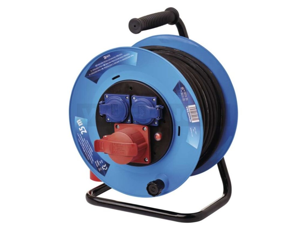 Při práci oceníte možnost připojení zařízení vyžadující tři fáze, a to při zatížení navinutého kabelu 400 V~: 6,25 A max./2 500 W a při rozvinutém kabelu 400 V~: 12,5 A max./5 000 W. Navíc je možno připojit další dvě zařízení na 230 V do dvou zásuvek, kterými prodlužovací kabel také disponuje.