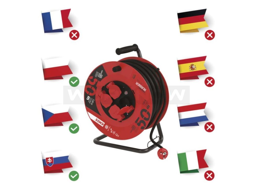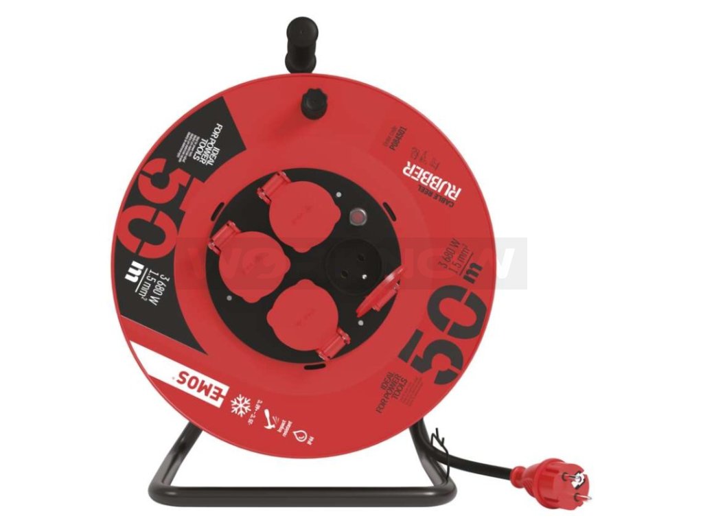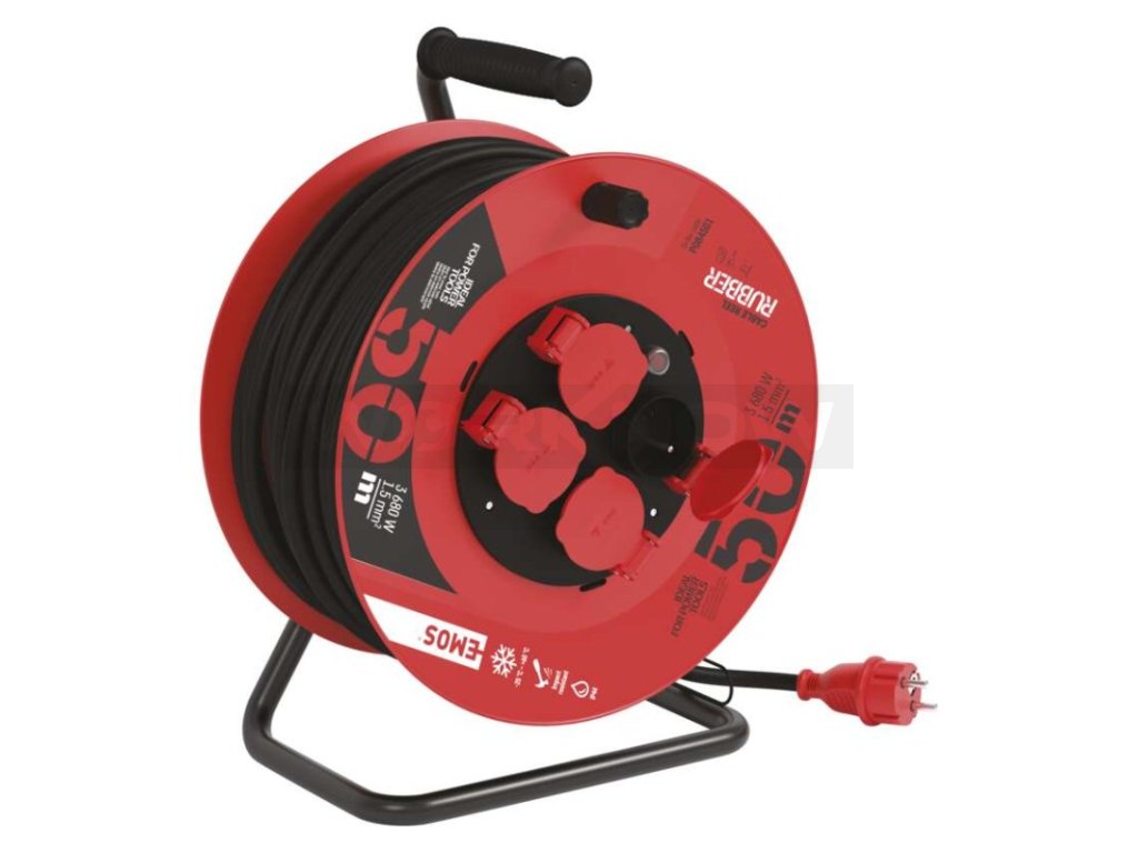 Gumový prodlužovací kabel na bubnu - 4 zásuvka s délkou 50 m, průřezem vodiče 1,5 mm2 a tepelnou pojistkou, odolný proti stříkající vodě.