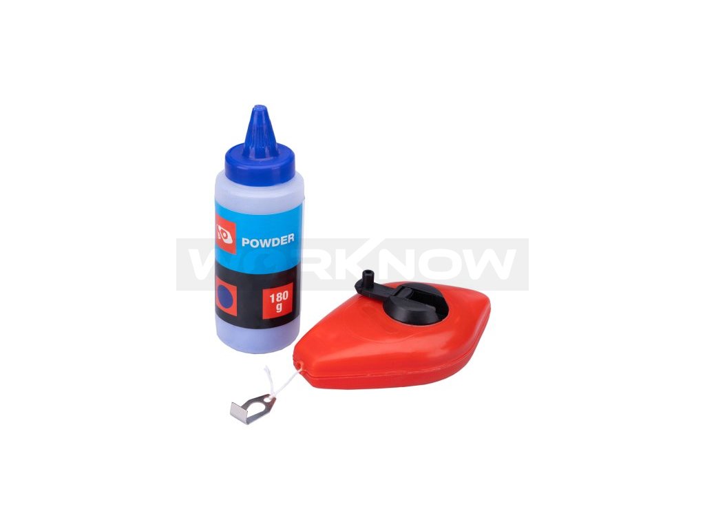 Sada navíječ a pudr, délka provazu - 30 m, hmotnost pudru 180 g, použití : označení přechodů - linií ve stavebniství ,malířství, SDK,..., po naplnění přiloženým pudrem ( modrý - lze doobjednat : modrý 37096, světle-modrý 37094, červený 37097, světle-červený 37095, černý 37098), postup : přiloženým pudrem naplníme navíječ, protřepáním a opakovaným vysunutím a opětovným navinutím provazku jej probarvíme, po-té ve dvou napneme provázek v potřebném místě vyznačení linie a lehve brnkneme - tím se pudr zachycený na provázku nanese v tenké vrtstvě na značený materiál, pak provázek navineme, popř. opět doplníme pudrem, balení: blistr s eurootvorem.