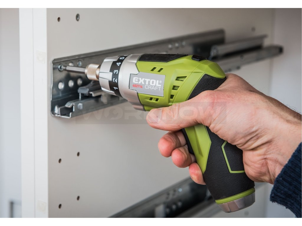 Praktický aku šroubovák určený pro utahování či povolování šroubů a matic. Při použití vrtáků se šestihrannou stopkou můžete i vrtat. Díky snadnému nastavení momentů při utahování už nikdy nepoškodíte šrouby nebo závity a s otočnou rukojetí se dostanete do méně přístupných míst. Aku šroubovák je vybaven brzdou rotoru, proto ho lze omezeně použít i při vybité baterii. Díky Li-ion akumulátoru je možné šroubovák kdykoliv dobíjet, aniž by se tím snižovala kapacita akumulátoru. Li-ion akumulátor ztrácí energii vlivem samovybíjení velmi pomalu a vydrží dlouho nabitý.- silná svítilna 120lm s integrovaným vypínačem - svítí 5-6 hodin